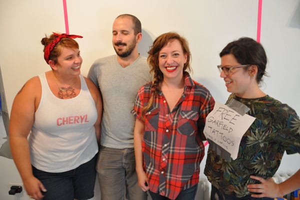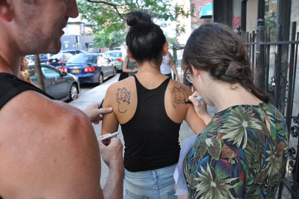 The atmosphere in the gallery is festive and you expect the absurd to occur … and it did. While I was chatting with two of the artists inside, Van Buren, who was doling out Garfield “tattoos” using a sharpie was outside performing her craft when she encountered another “tattoo artist” also offering free sharpie-rific Garfield tattoos to passersby.