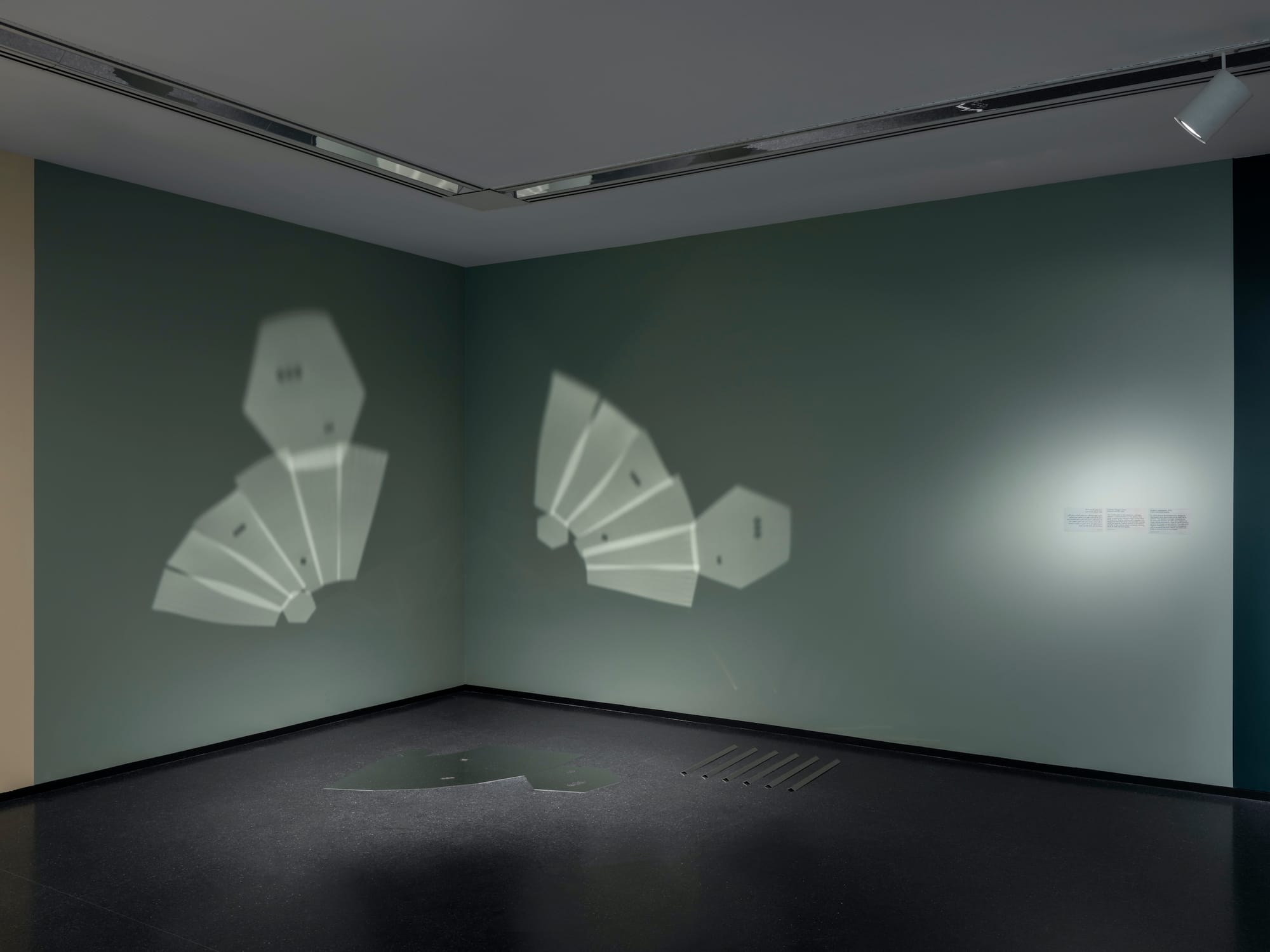 How these transformations happen is a matter of geometry, light, form, color, and materials. As with most things of extreme simplicity — remember, we’re talking one diamond shape, that’s all — repetition can be helpful, and many of Taghavi’s artworks come in series. There is a set of polished stainless-steel prisms into which one can peer through noghte cutouts, to see her motif reflected ad infinitum inside, like a sparkling universe. Four- and five-sided versions have been built into the gallery entry, with peepholes cut right into the drywall, as if the very architecture of the museum contained the cosmos. A triangular example stands in a corner, its entire structure laid bare but no less magical for it, and a hexagonal one lays on the floor, unbuilt, its pieces in an orderly arrangement, casting mysterious reflections of light onto olive walls.