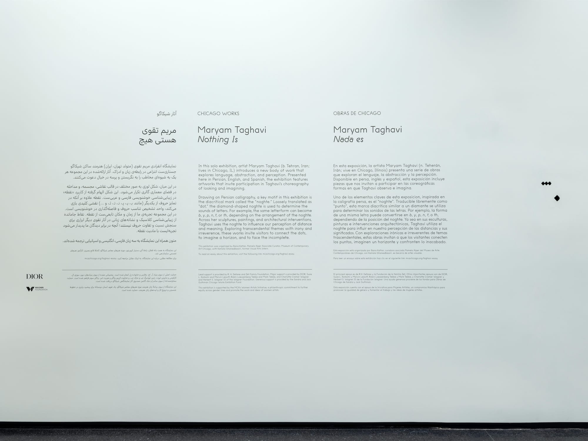 Born in Tehran, Taghavi moved to North America in 2000, studying art first in Vancouver and later in Chicago, where she has lived since 2014. Though there is not a sizable Persian community here, all the exhibition texts have been translated into Persian, a first for the MCA, which became officially Spanish-English bilingual in late 2022. Proper usage of the noghte abounds.