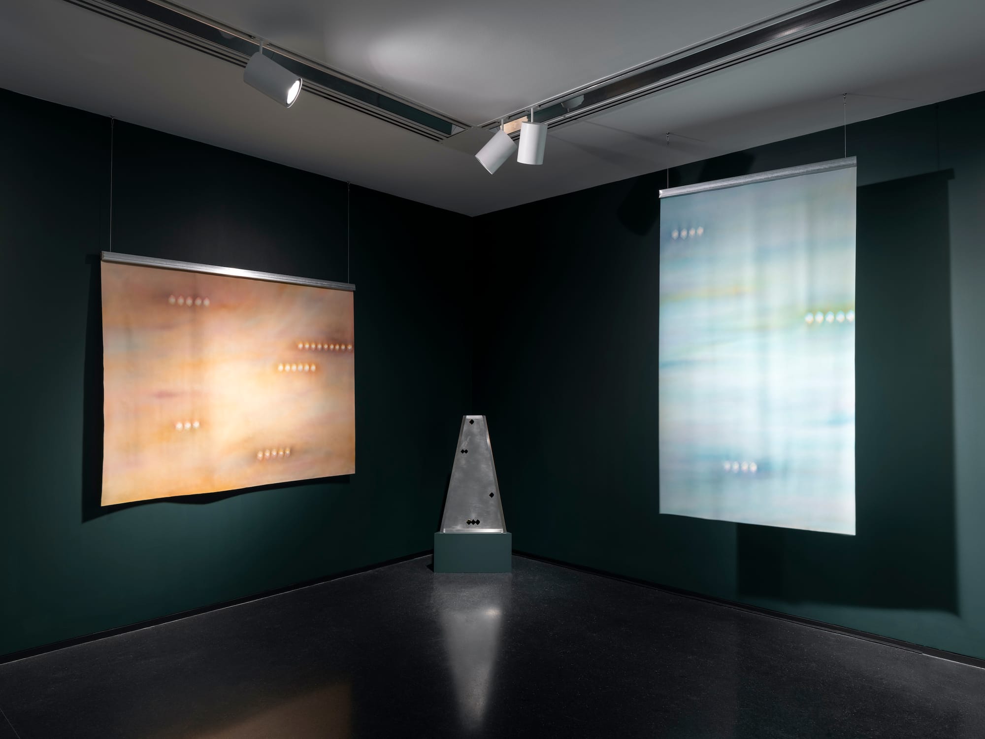 Eight paintings from Taghavi’s Horizon series hang in the second gallery, against a backdrop of dark forest green. These look as ephemeral as their eponym, their airbrushed hues the colors of dawn, and of Lake Michigan on a moody day. Mostly made on delicate crepe de chine and suspended from the ceiling at irregular angles, excepting a pair draped from nails, they feel barely tethered to the world. Here the noghtes float in horizontal groupings, shapes left unsprayed and hazily out of register, shimmering like the optical effects of light at daybreak and on a large body of water.