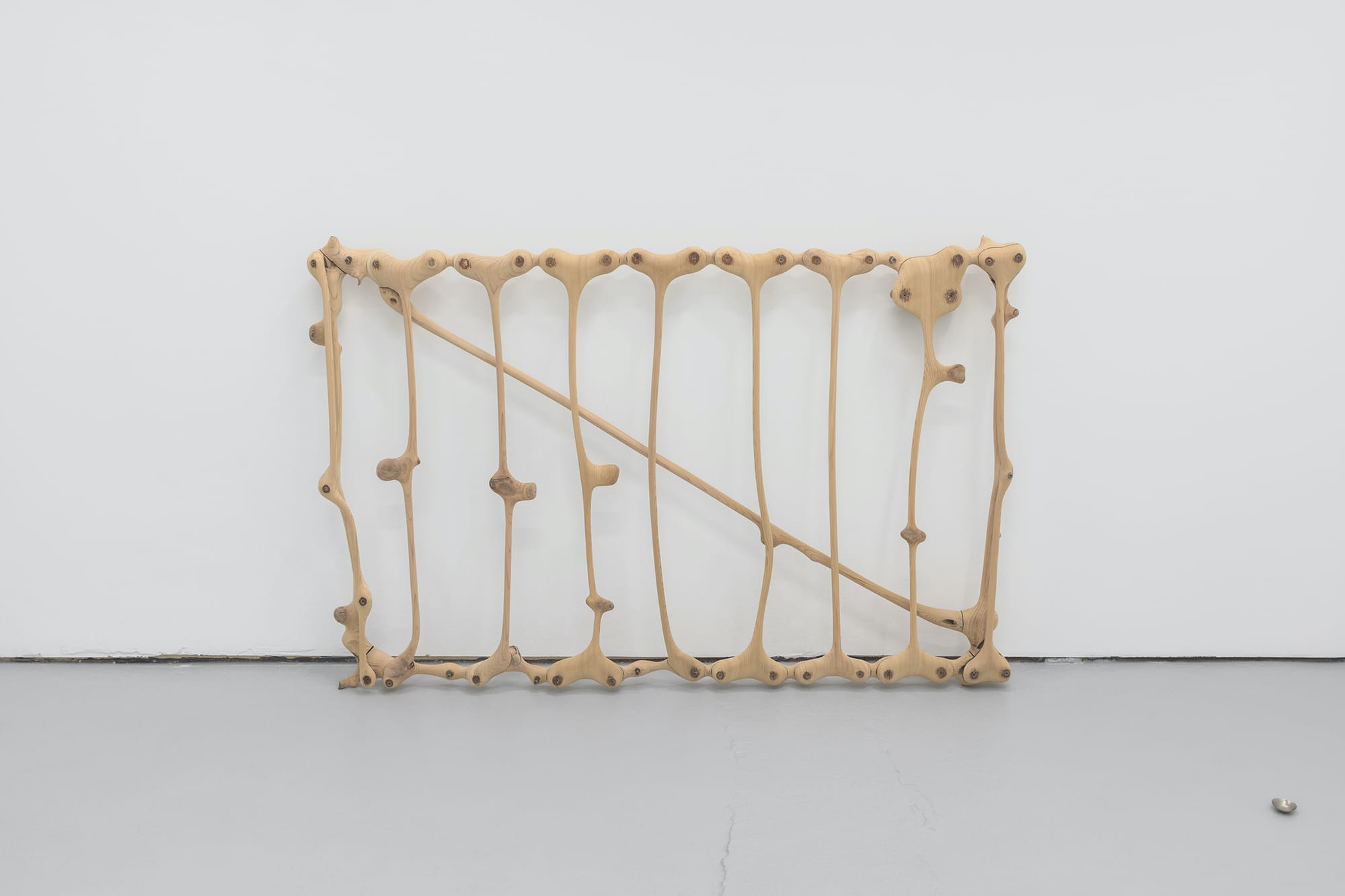 The subjects in Skin Horse are a found wooden gate, a few dozen foreign coins collected by the artist’s step-grandmother, and a cuttlebone. Nothing really has a title or a date, just a material identifier. The purposes of the first two will be familiar, but I had to look up the third to learn that it’s the internal shell of a cuttlefish, used for buoyancy control and also commonly sold in pet shops as a dietary supplement for caged birds. What Morehead does with these items is work them slowly, repeatedly, and keenly until they have superseded their original use and become something else entirely. The wood of the gate is whittled away until all that remains are impossibly spindly lengths with smooth bulges where knots and hardware have been left in place. The effect is curiously anthropomorphic, screw heads staring like pairs of eyes, knots like bony protuberances, bendy rods caught mid-motion. The coins, hammered against a small block of steel until they thin out and curve into dappled bowls an inch or two in diameter, shine in shades of copper, bronze, and nickel. They’re laid out haphazardly on the gallery’s concrete floor like tiny precious offerings. The cuttlebone, naturally brittle and hard, undergoes the oddest of alterations, its strata carefully chiseled and scraped away until a life-size replica of the artist’s ear emerges.