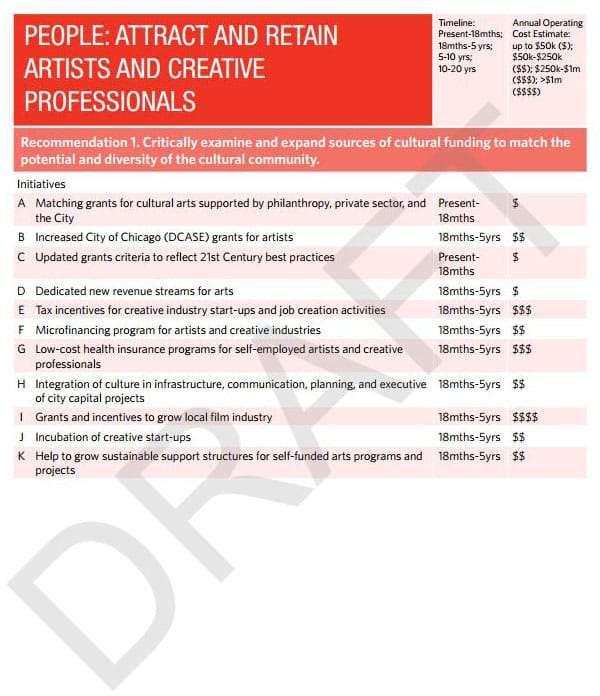 As reported here earlier in the year, the plan is the first comprehensive arts strategy for Chicago since the 1980s. The various city organizations and consultants that have steered the process have tried to involve the public as much as they can through public meetings and brain-storming sessions. The draft plan that results from this is in fact two documents: one containing the bullet points (warning: it’s still 64 pages long), and the other containing the specific funding mechanisms for the proposals.