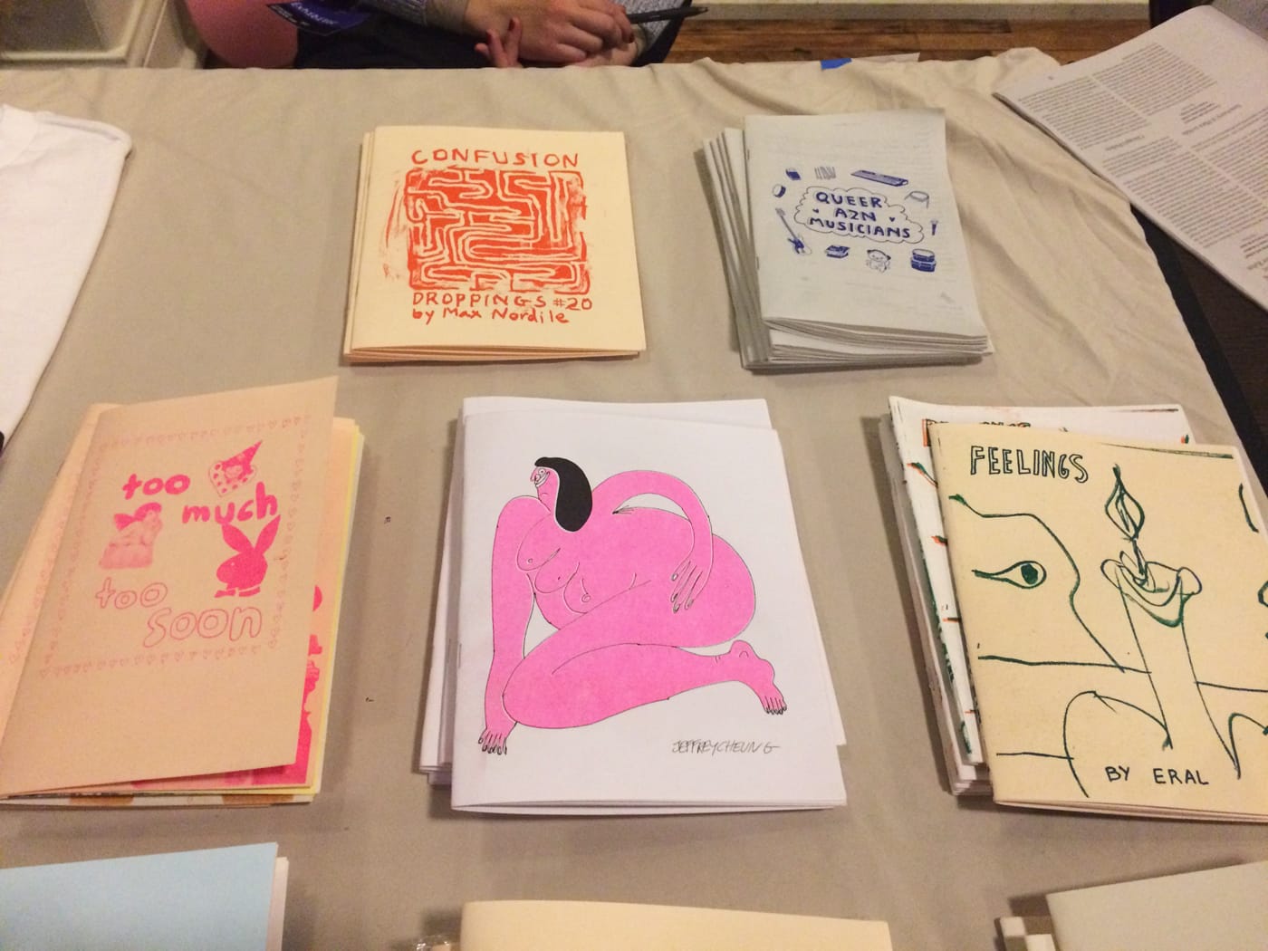 That intention comes through clearly as you stroll through the fair, whose layout encourages exploration. There aren’t separate sections for zines or rare books; instead, risograph prints, buttons, and patches neighbor $500 artist books. Although you’ll also find sleek titles that will make you nervous about thumbing through, there’s a clear emphasis on DIY projects here; you don’t have to break the bank to walk away with a trove. And, as Valentine hinted, you’ll find more than paper-based objects here. To give a few examples: among the wares at local gallery fernway is a fruity-flavored puzzle by Kevin Goodrich; Chloë Perkis is offering dangly, wicked earrings among an array of dynamite comics; and stop by EPISODE to make your mark with one of the six artist-designed rubber stamps for sale and contribute to an ever-changing work of art.