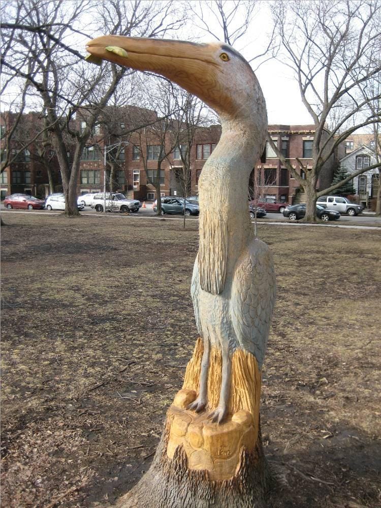 The program essentially presents the city with a growing outdoor exhibition, as each finished tree remains in place for as long as it is secure. In Lincoln Park, five trees depicting peaceful figures with clasped hands still stand tall, carved by local artist Kara James in 2014; in Nichols Park, a tall heron by artist Jim Long has gazed upon its surroundings for two years. The Chicago Tree Project gives artists an opportunity to work on a large scale, and for some, a chance to experiment in a new medium. At the same time, it introduces whimsical encounters into public spaces — and creates a citywide treasure hunt of sorts.