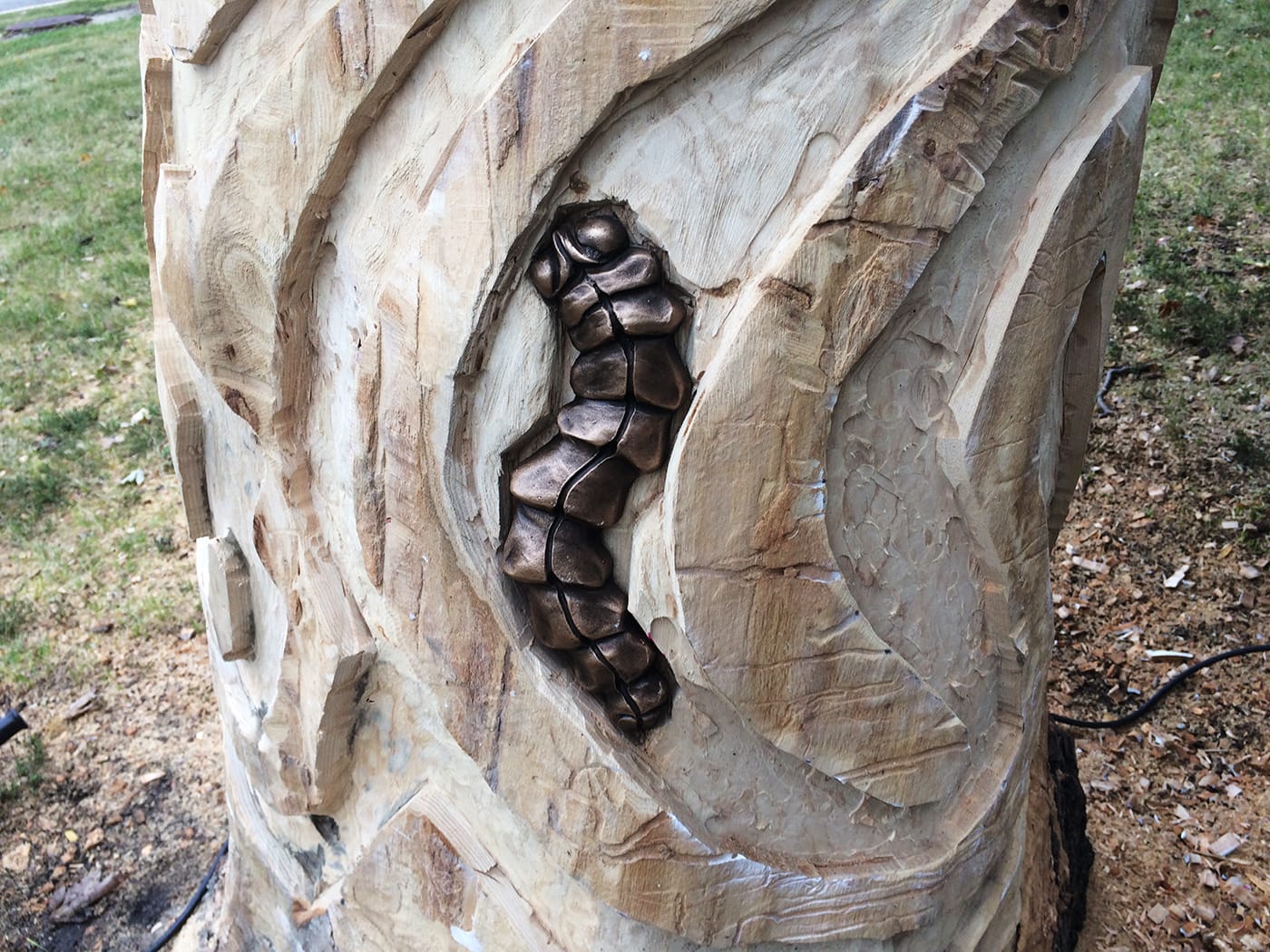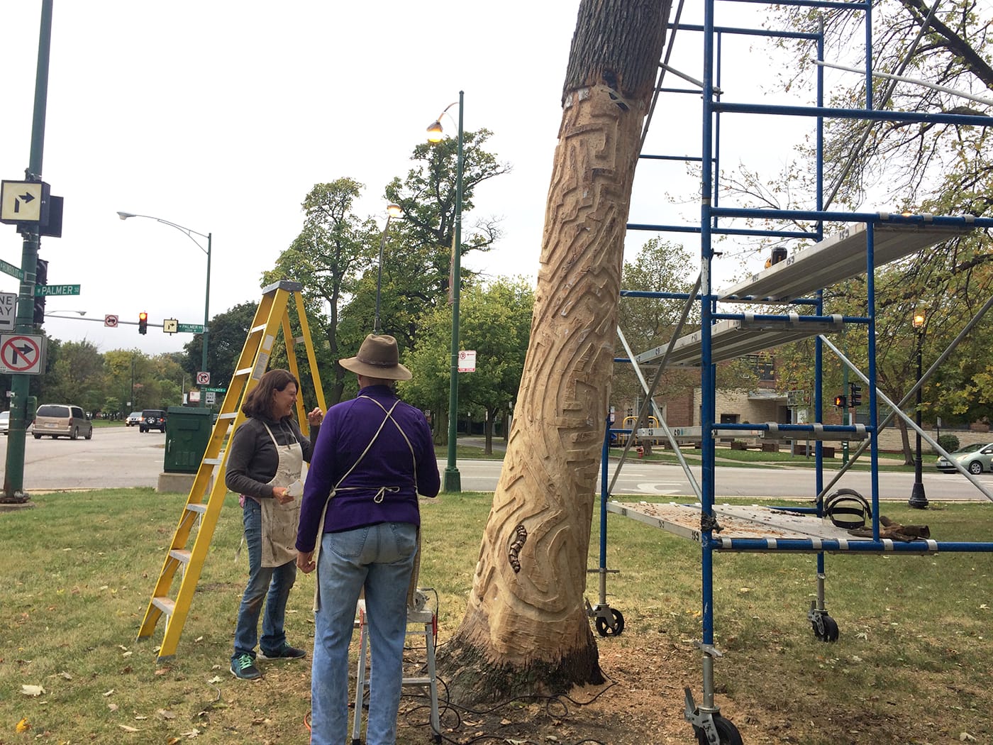 By now, with the temperature dropping, most of this year’s artists have already finished their trees or will soon complete them. On a recent Thursday, I watched artist Janet Austin and her assistant work on a tall ash tree on the edge of Palmer Square Park. They had debarked the tree in September and were carving a maze that wraps around its naked truck — a design that nods to the winding tracks, known as galleries, that emerald ash borer larvae make when they feed beneath bark. Austin also created about a dozen bronze sculptures of the larvae that she was going to embed into the tracks, so the final piece literally depicts the tree under attack.