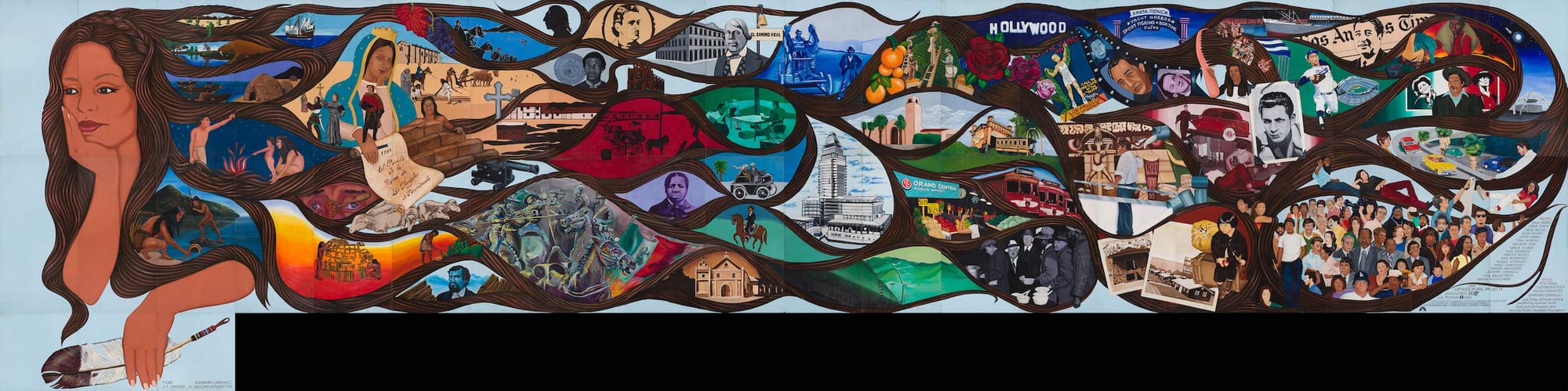 After receiving the commission for the mural in 1981, Carrasco engaged in months of research to select her subject matter, consulting with Bill Mason, the NHM’s in-house historian at the time, who gave her access to the museum’s vast photographic archives. He told her that the Spanish named the city “El Pueblo de la Reina de Los Ángeles” (“The Town of the Queen of the Angels”), a detail that became the mural’s conceptual framework: 51 scenes from the city’s history embedded in the flowing locks of a proud, brown-skinned female figure modeled on the artist’s sister.