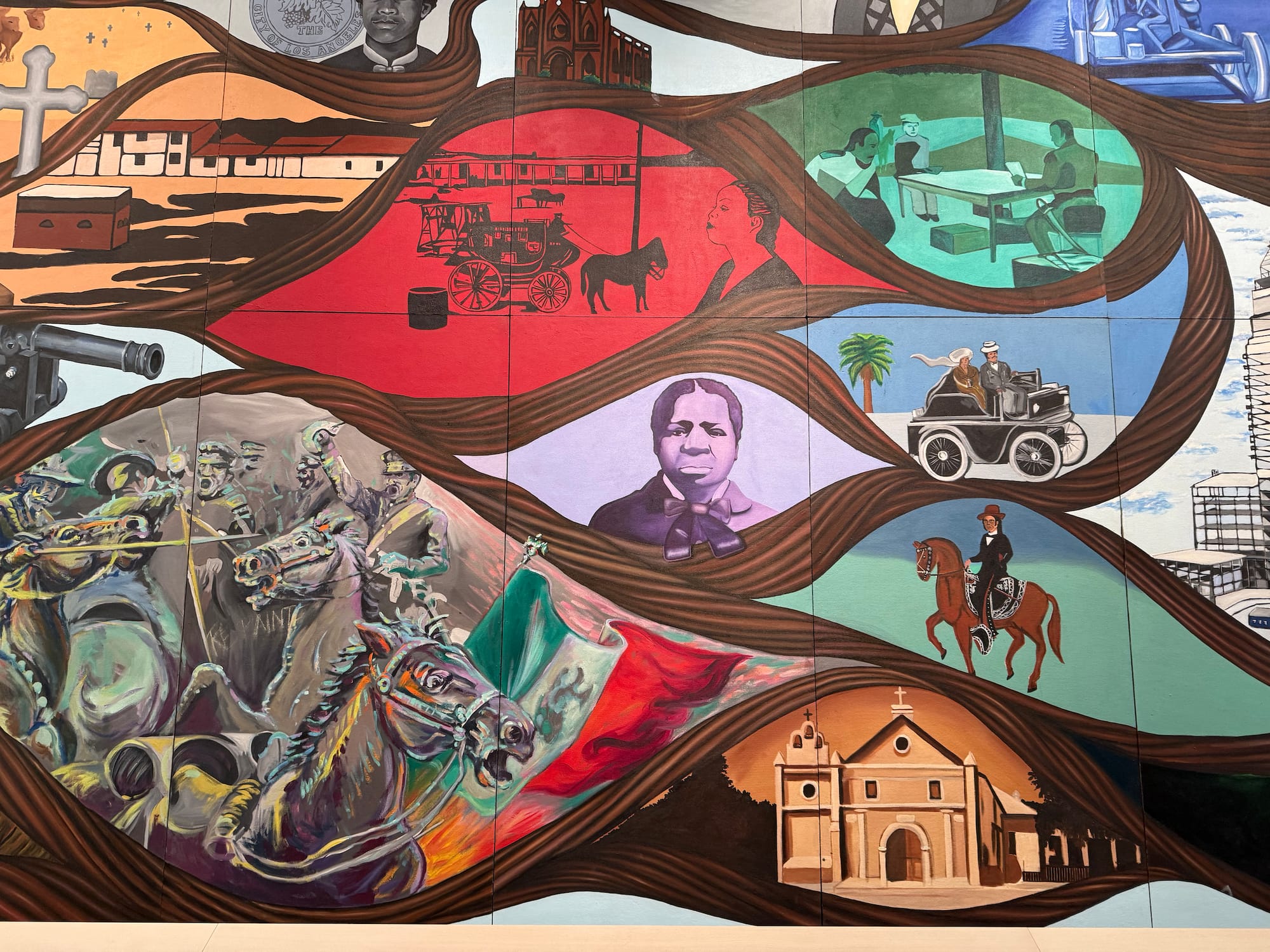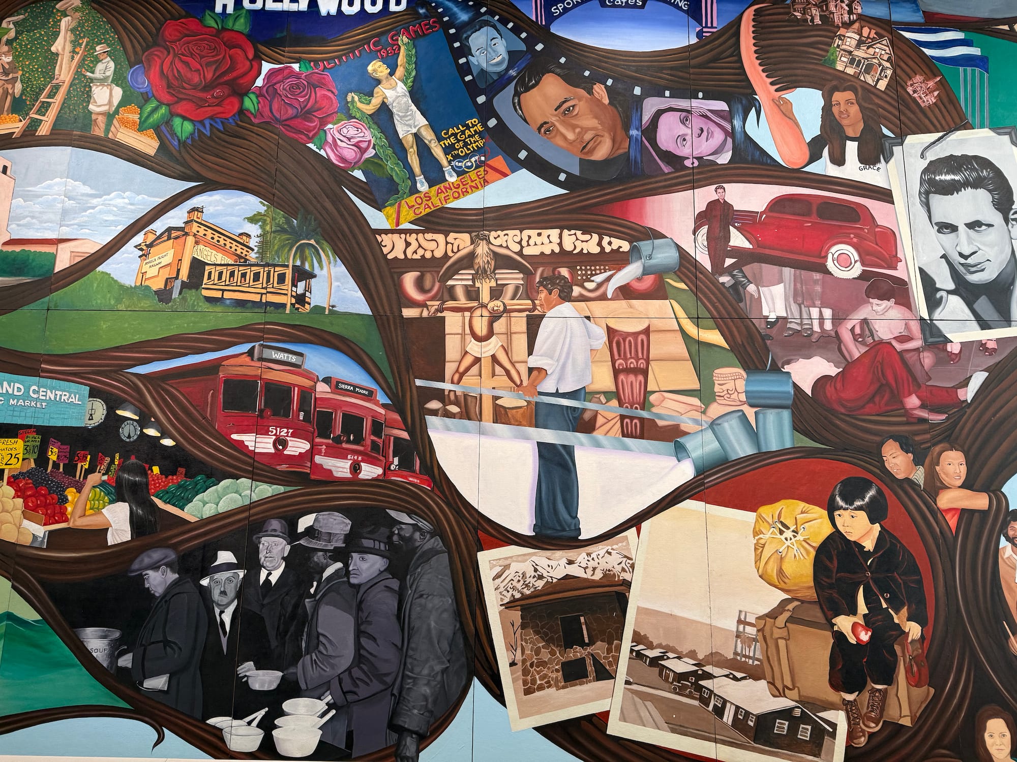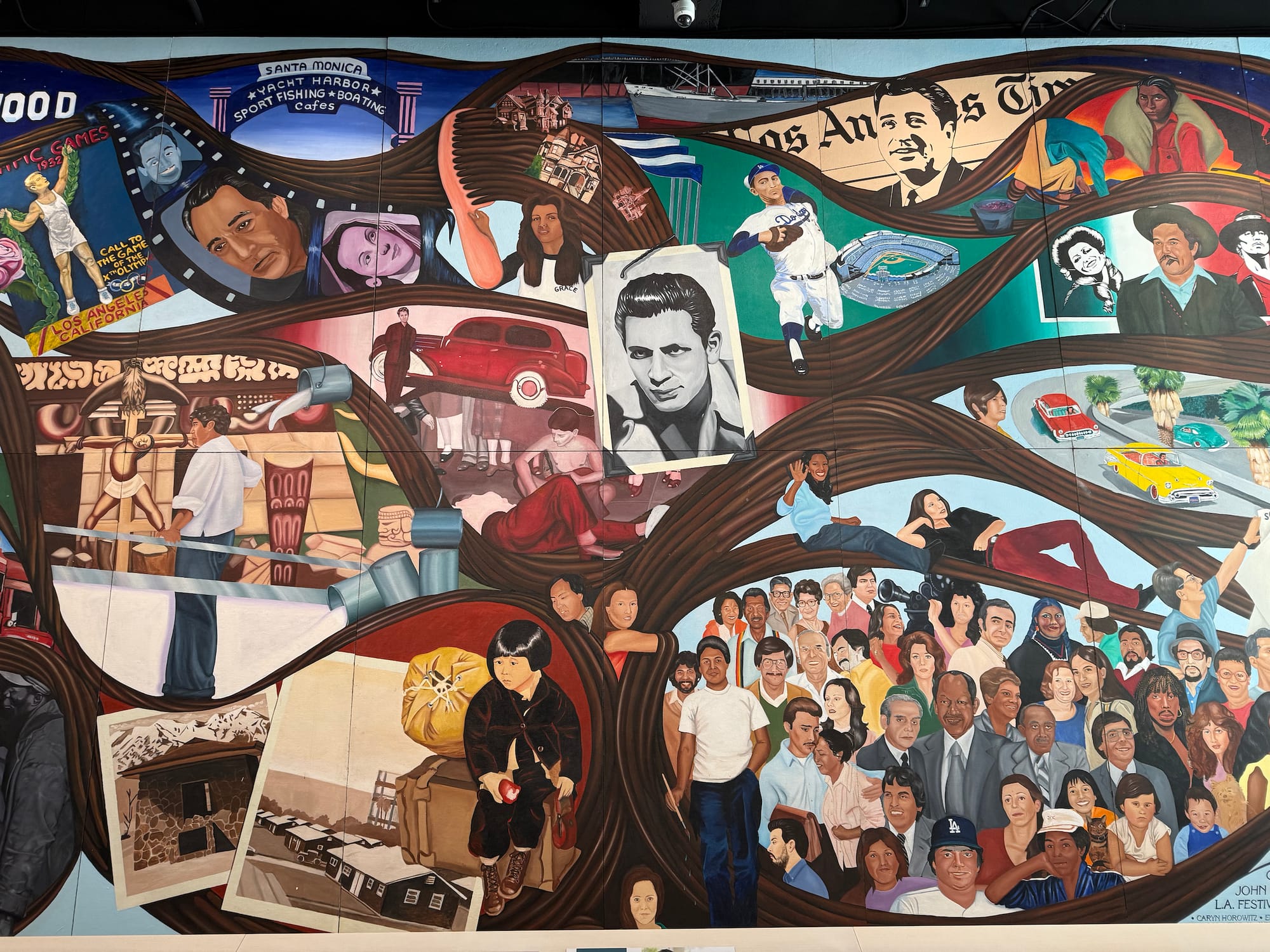 The mural showcases the city’s diversity, including depictions of LA’s first synagogue; Jewish baseball player Sandy Koufax; Chinese immigrants building the railroads; Pio Pico, the last Mexican governor of California; snapshots from Japanese-American concentration camps; and Biddy Mason, a formerly enslaved woman who became one of LA’s most prominent landowners.