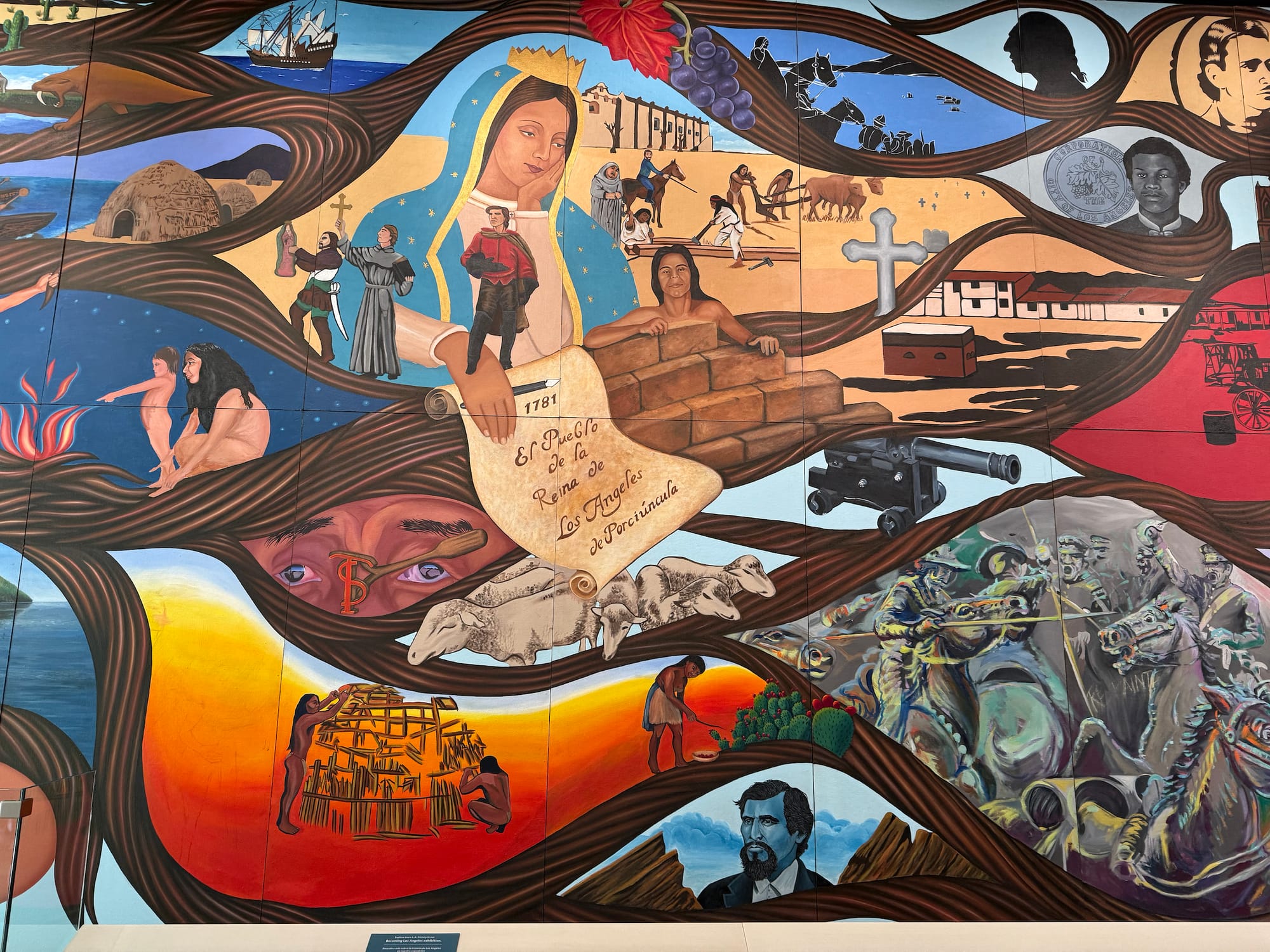 Working with three assistants — Glenna Avila, Rod Sakai, and Yreina D. Cervantez — and a team of young artists from Los Angeles County’s Summer Youth Employment Program, Carrasco portrayed the area’s original inhabitants, the Gabrielino/Tongva people; episodes from its Spanish and Mexican history; and notable figures and events, both well known and unheralded, painful and celebratory, that have marked its transformation into the heterogeneous, sprawling metropolis it is today.