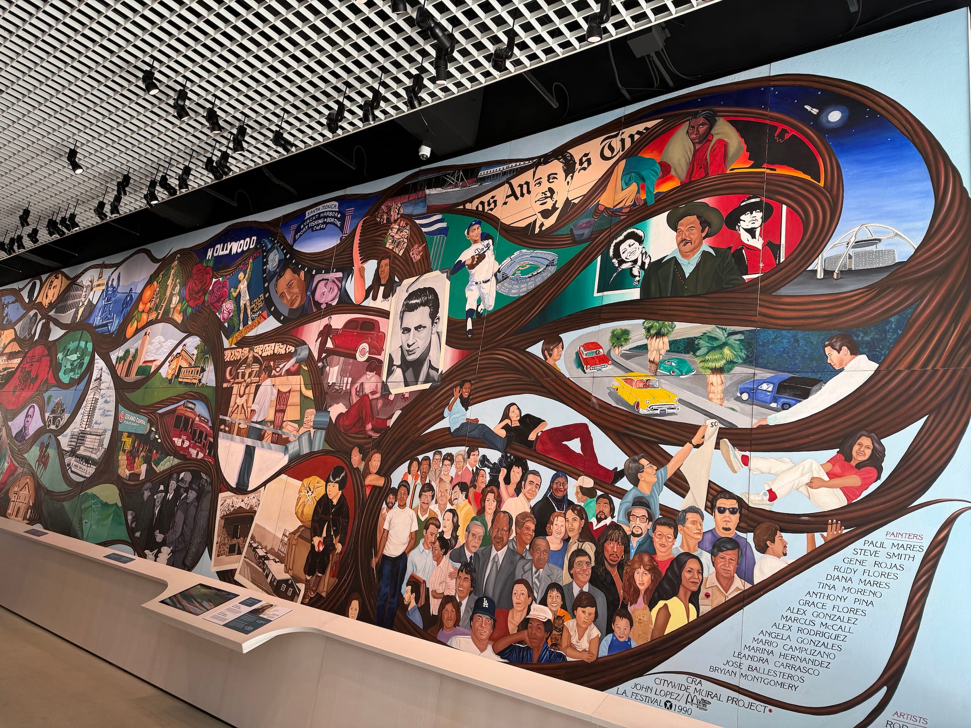 The massive mural has only been exhibited a handful of times in the last four decades. It was shown at Union Station in 1990, and again in 2017 when it was included in ¡Murales Rebeldes! L.A. Chicana/o Murals Under Siege, a Pacific Standard Time: LA/LA exhibition co-curated by LA Plaza de Cultura y Artes and the California Historical Society. The following year, it was the centerpiece of Sin Censura: A Mural Remembers Los Angeles at the NHM, which acquired it in 2020 with a grant from the Vera R. Campbell Foundation. In the new installation, digital touchscreens will offer visitors information about the figures and events depicted.