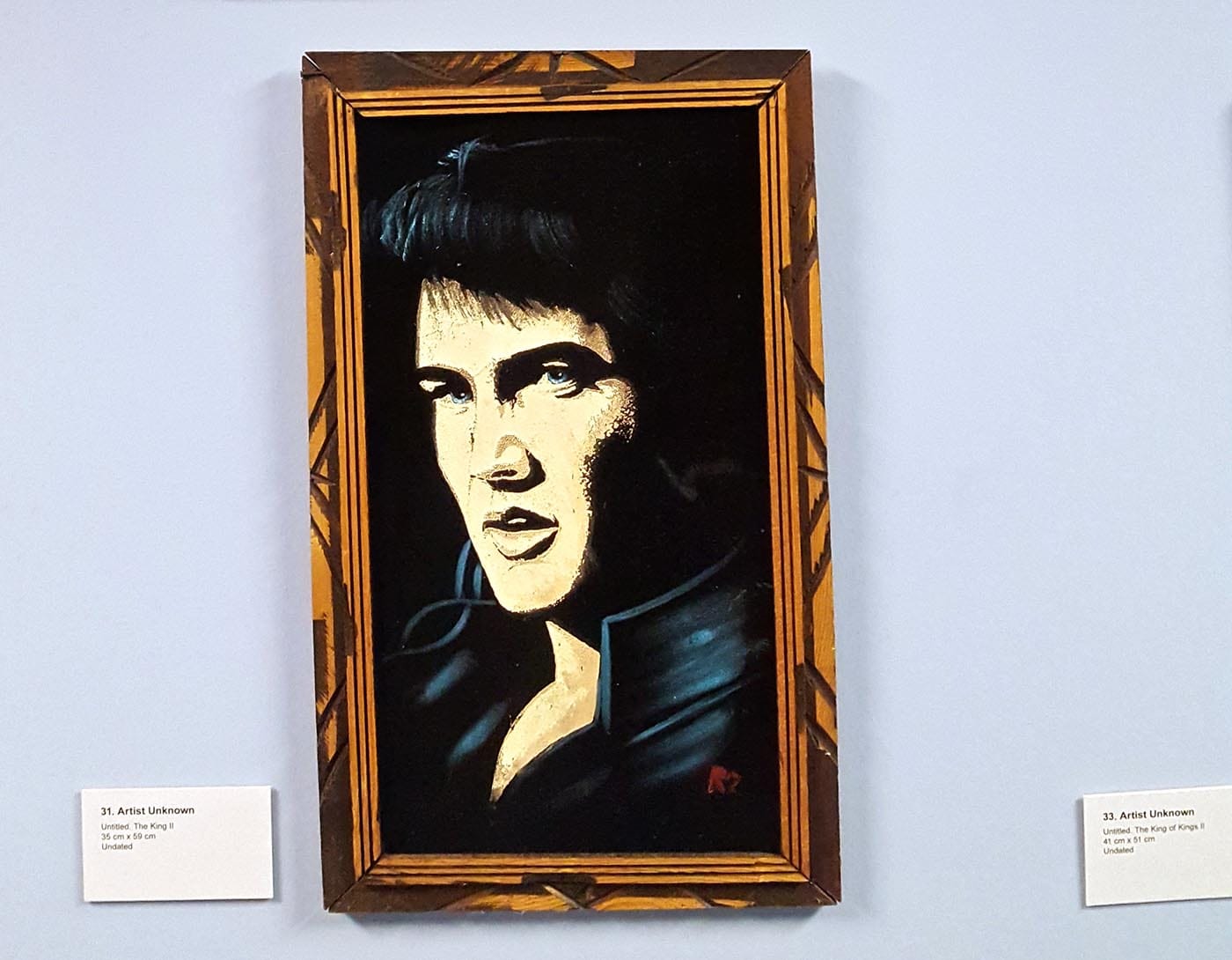 The exhibition contains 80 official works, with more constantly turning up, as part of an open call to the community to bring in examples of velvet art from their homes for temporary display with their brethren. These works are grouped by subject, showcasing the perennial motifs enjoyed by velvet painters and collectors: landscapes, Elvis Presley, matadors, big-eyed children, Emiliano Zapata, Jesus, and cock fights, to name a few. Some of these convey explicitly indigenous themes, such as renderings of the legend of Popocatépetl and Iztaccíhuatl — a pair of volcanos in central Mexico that, according to Nahuatl legend, were once two humans deeply in love. Paintings in this genre present Popo and Izta in a dramatic tableau, as the warrior learns of the death of his princess love. They usually feature a man in feather-bedecked warrior garb holding a woman wearing a white dress and in a fainting posture. Others derive some sense of cultural currency from renderings of flamenco dancers and bullfights, in spite of those subjects’ connections to the colonizing influence of Spain. Naturally, there are numerous religious portraits, particularly of the Virgin de Guadalupe, and an array of different takes on Jesus, including ones that Herrada has affectionately nicknamed “pregnant Jesus,” “cross-eyed Jesus,” and “pink blood Jesus.”