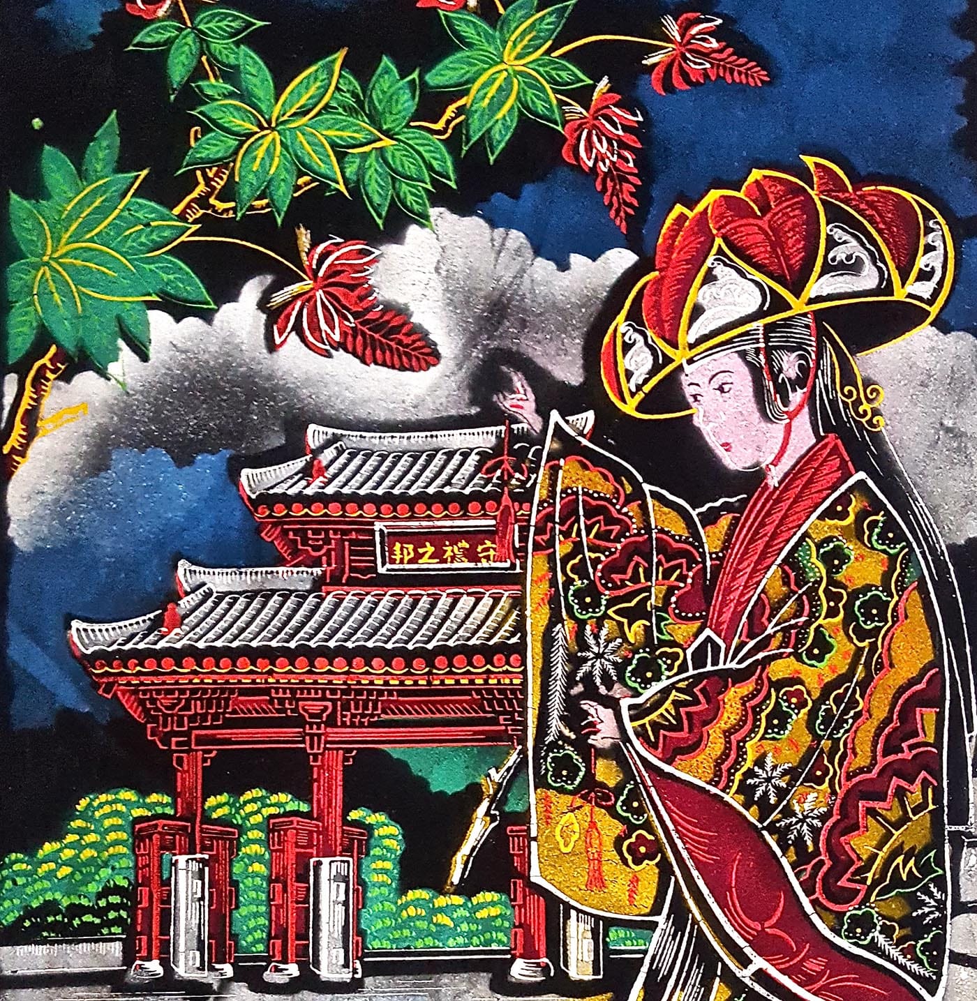 These religious icons connect to the earliest origins of velvet painting as a tradition. The practice is thought to originate in Kashmir, where the fabric was first made. The deep black canvas makes colors stand out in contrast, and the first velvet paintings leveraged this high contrast to add drama to religious iconography. In creating images by adding light to a dark surface, velvet painters are essentially working in relief—the technique is similar to scratchboard etching. The surface of velvet is obviously very different from smooth gessoed canvas as a substrate, and velvet painters have an array of adaptive techniques that involve dabbing and spattering paint so as not to saturate the canvas — and some have even, as Mexicantown CDC Executive Director Raymond Lozano learned, developed a very rasquache form of bootleg airbrushing.
