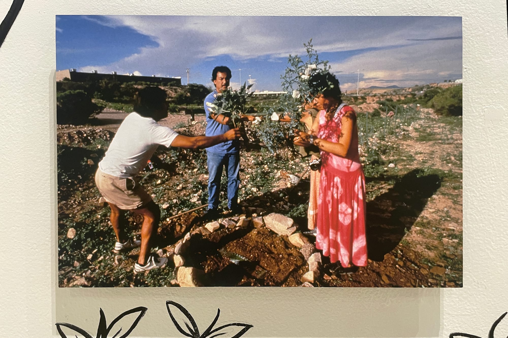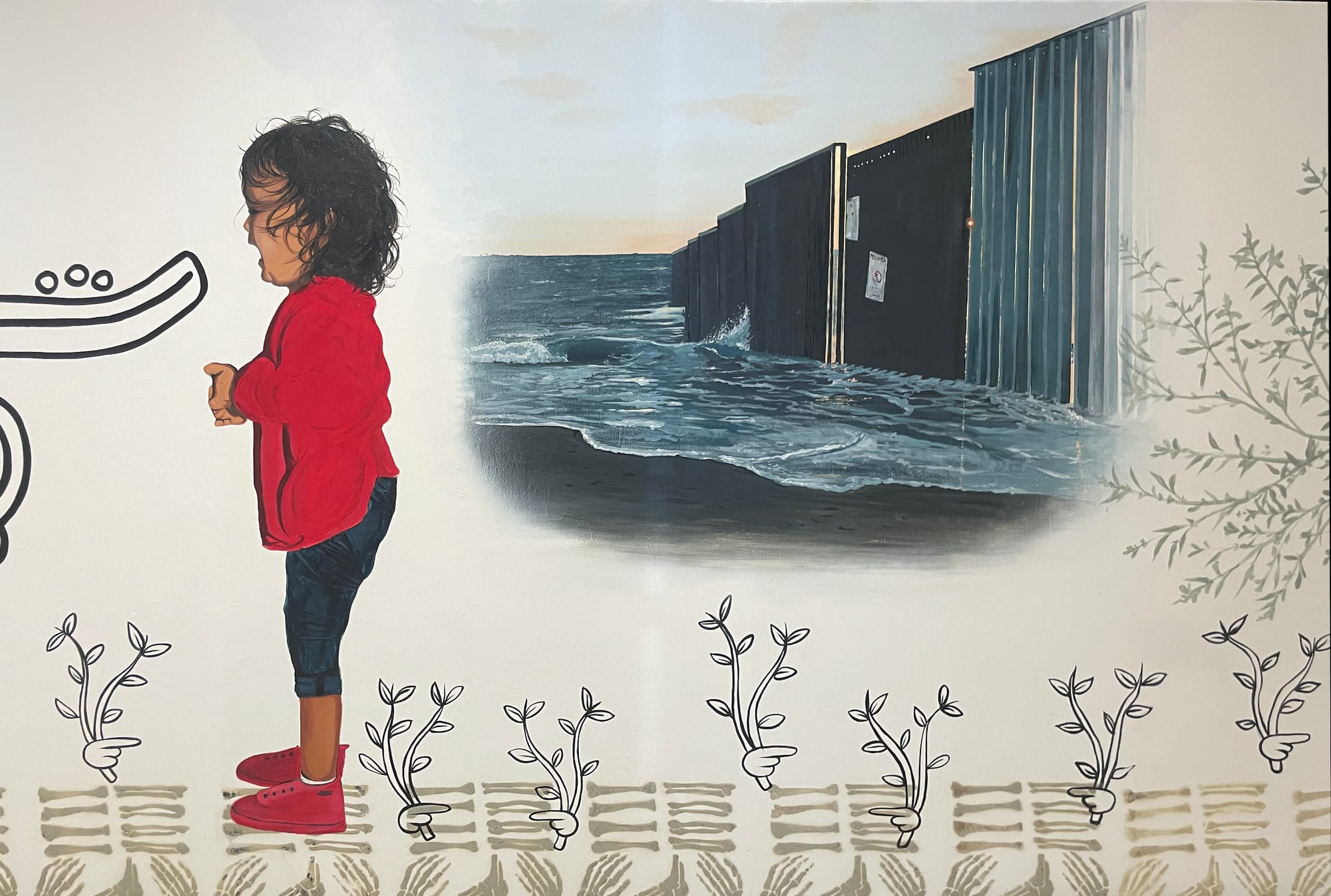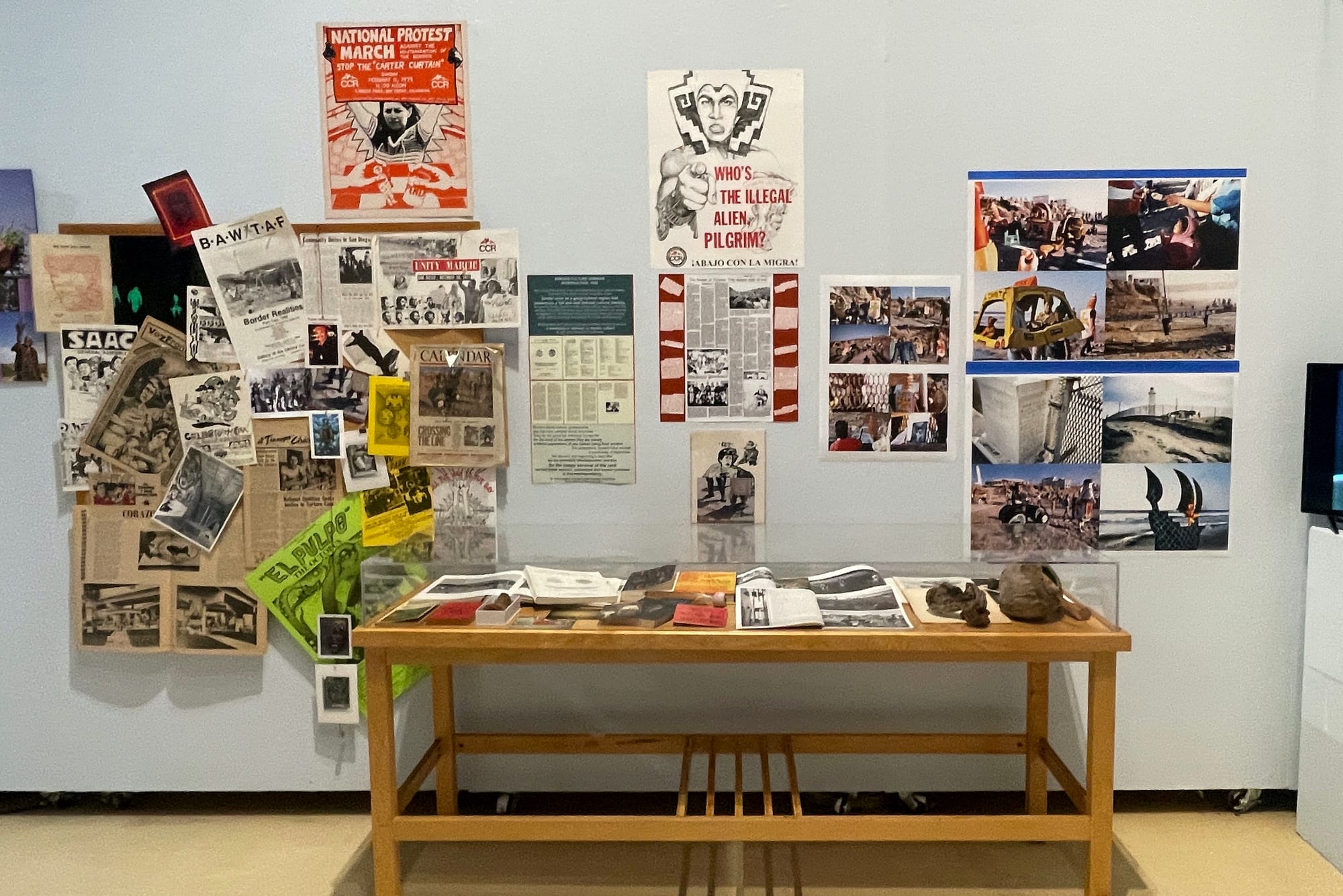 Another section of the exhibition shows documentation from “Poblado Maclovio Rojas” (1997), a community-engaged mural project spearheaded by “The Three Graces,” or Berenice Badillo, Lorenza Rivero, and Rebecca Rivero. In Colonia Maclovio Rojas, a makeshift community near Tijuana where shelters are constructed from garage doors and cardboard, the Three Graces collaborated with local youths to paint more than 400 feet of the garage door facades; bold renderings of plants, nature, and children celebrate everyday life. Artistic interventions like this one brought media attention to the border, dispelling myths of war and crime, and celebrating a women-led movement that had built a bustling society including a bank, soccer field, and community resource center.