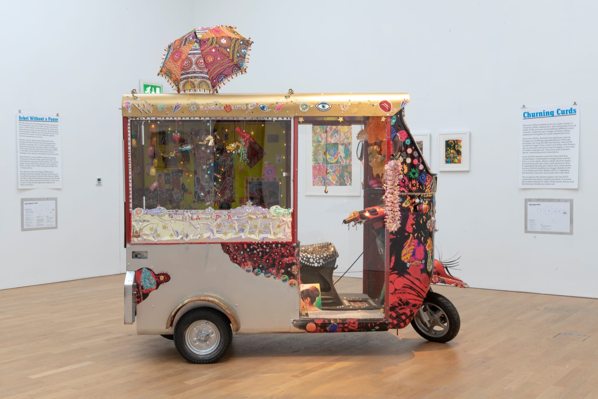 A major milestone amid her four decades of creating playful yet politically charged work across mediums, the outdoor installation navigates themes of cultural heritage, identity, gender, and memory in her trademark style. Indian motifs such as peacocks and tigers appear alongside Hindu goddesses Kali and Lakshmi. Embroidered eyes and lips, firework tiles on the steps, and a glittering ice cream van — a nod to childhood memories of her father’s ice cream truck, featured in several of Burman’s works — invite viewers along on a journey into Burman's radical, fantastical world.
