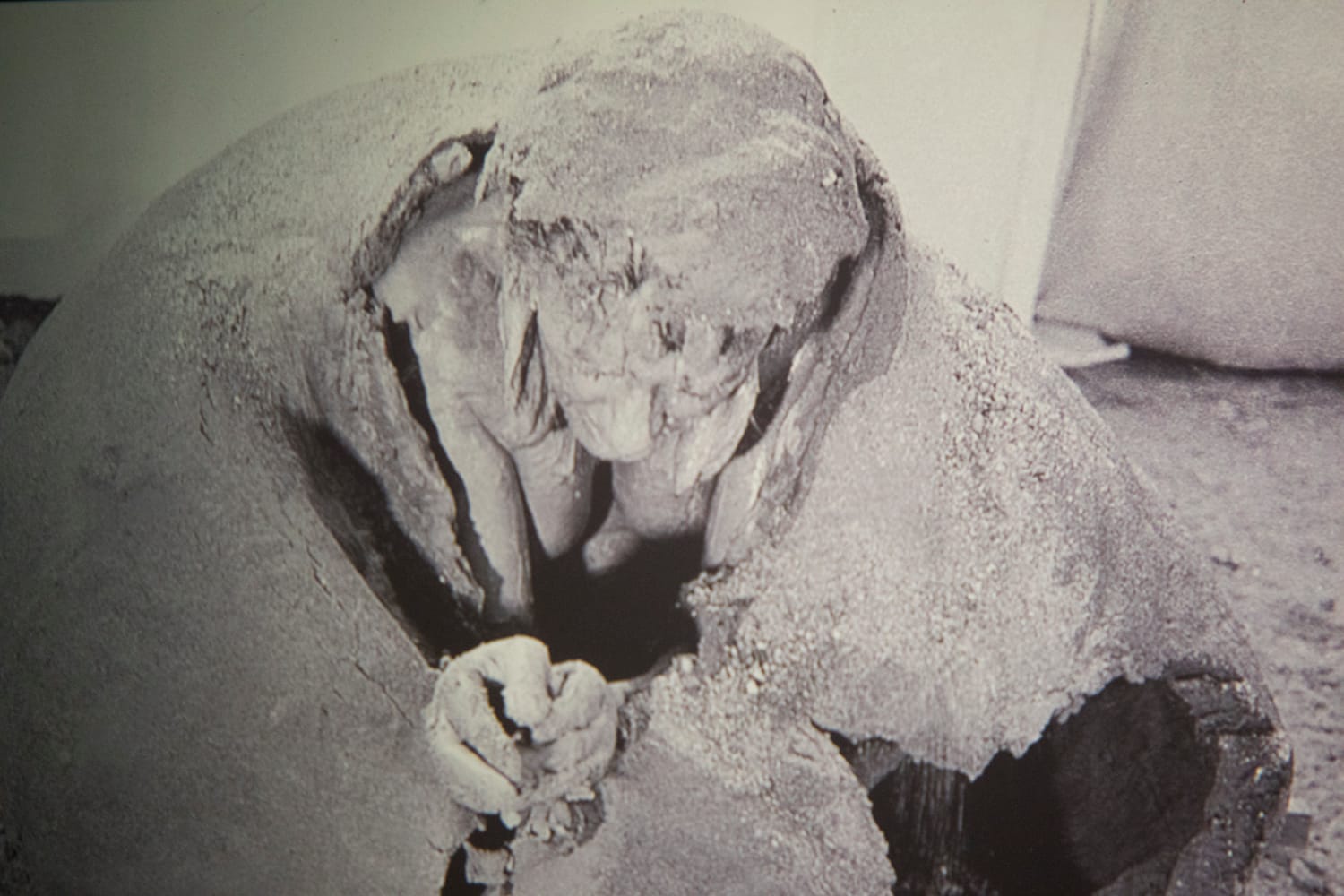 And there is Celeida Tostes’s “Passagem (Passage)” (1979), showing the artist first covered in clay inside a large vessel, her head crowning out the top, and later her clay-covered body fallen to the ground.