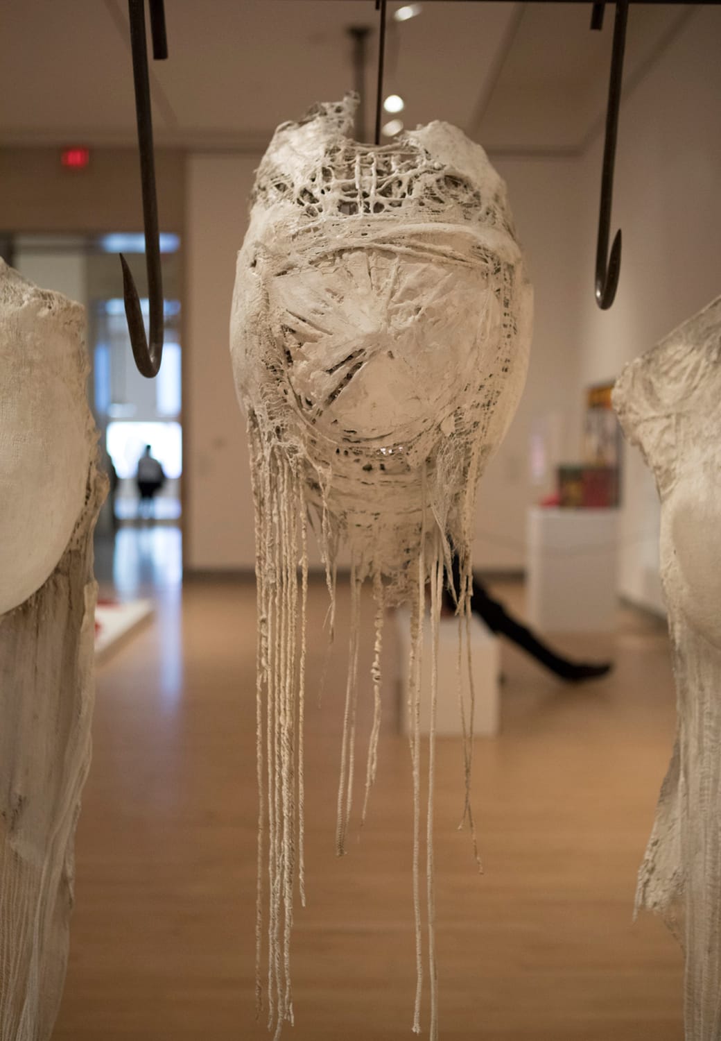 There are Johanna Hamann’s “Borrigos (Bellies)” (1979-83), incredible casts of pregnant bellies hanging by meathooks on a freestanding metal rack. Seen from the other side, the interior resembles a woven basket.