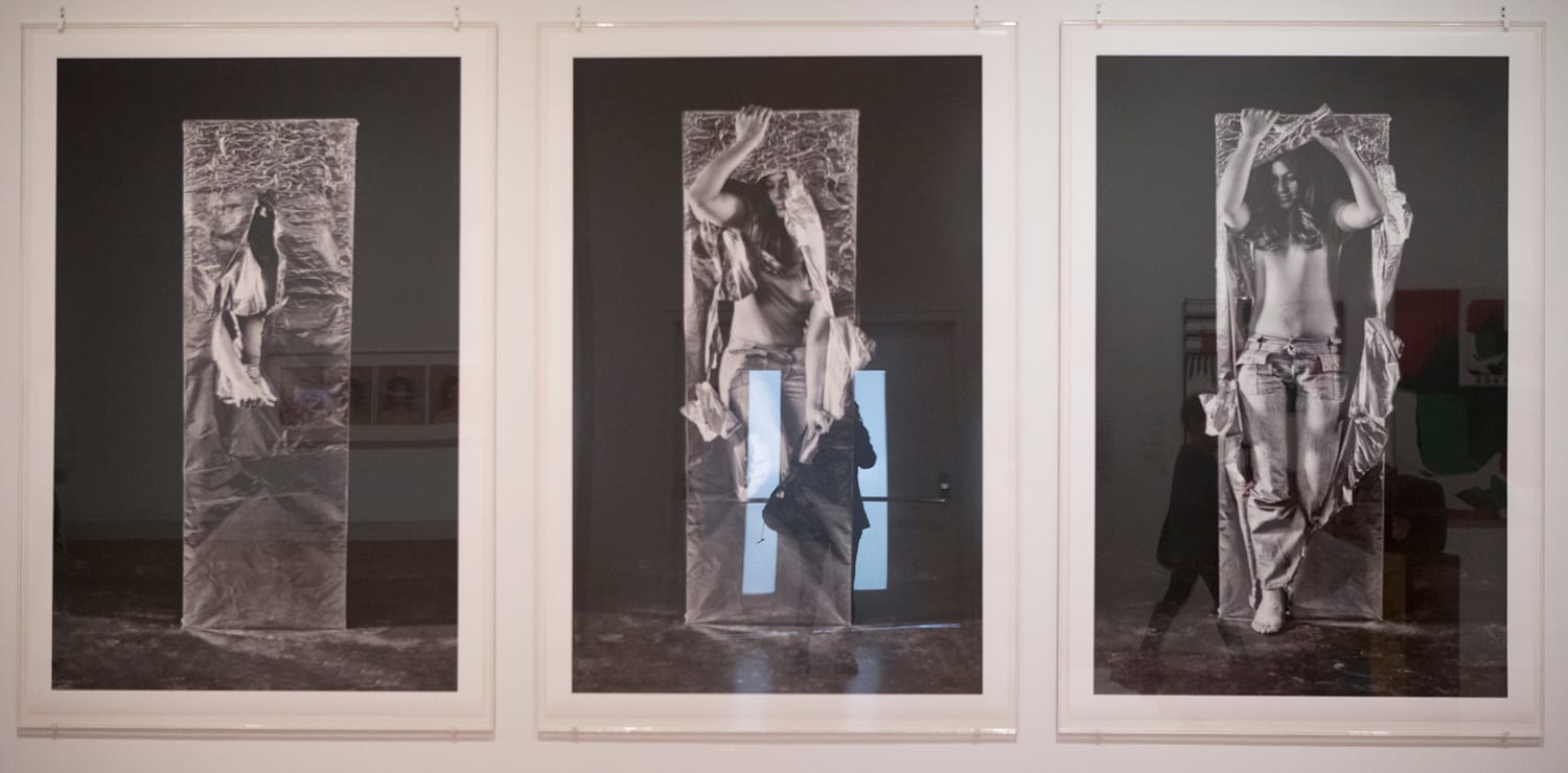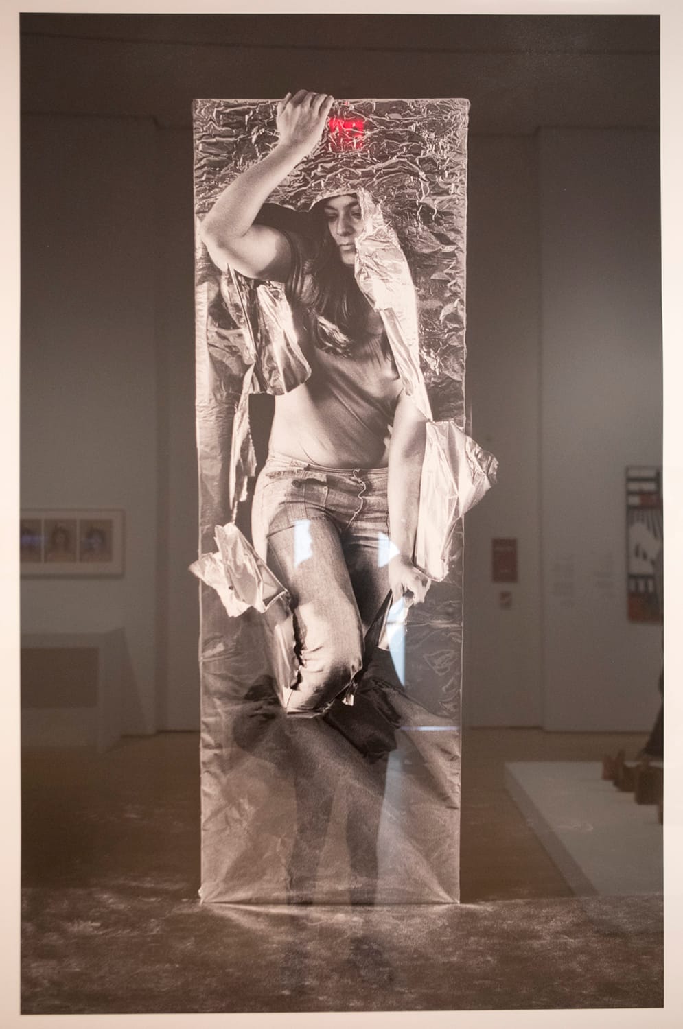 Many works allude to being born into the world. There are three luscious, large-scale, black-and-white images by Lourdes Grobet titled Hora Y meida (Hour and a half) (1975) in which the artist breaks through a doorway, walled off by a sheet of tin foil.