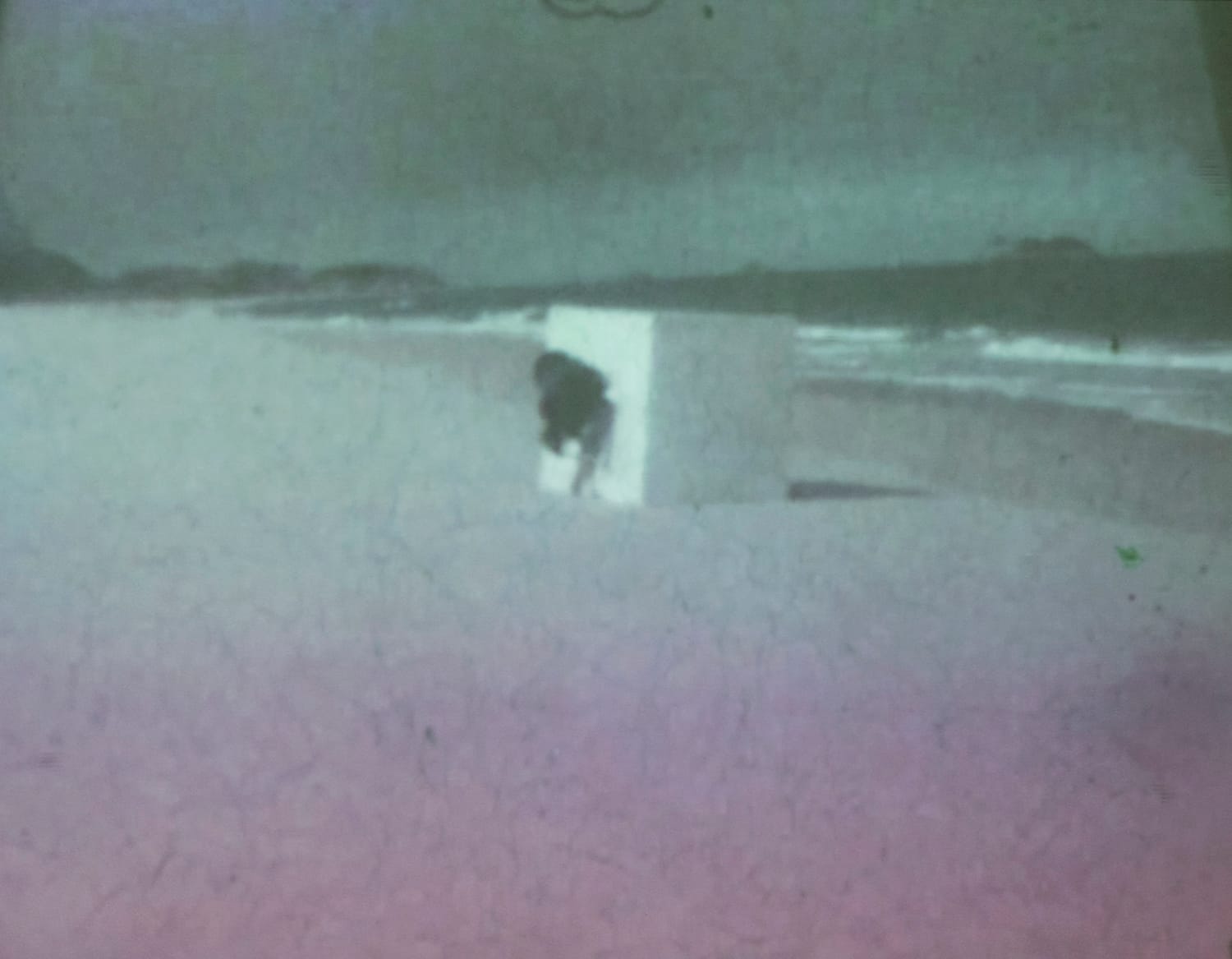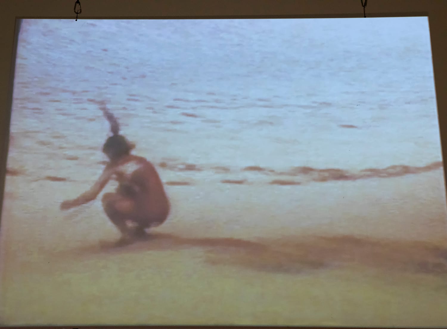 There is Lygia Pape’s color video “O ovo (The egg)” (1967) in which she is “born” from a white box sitting on the sand with the pounding surf in the background.