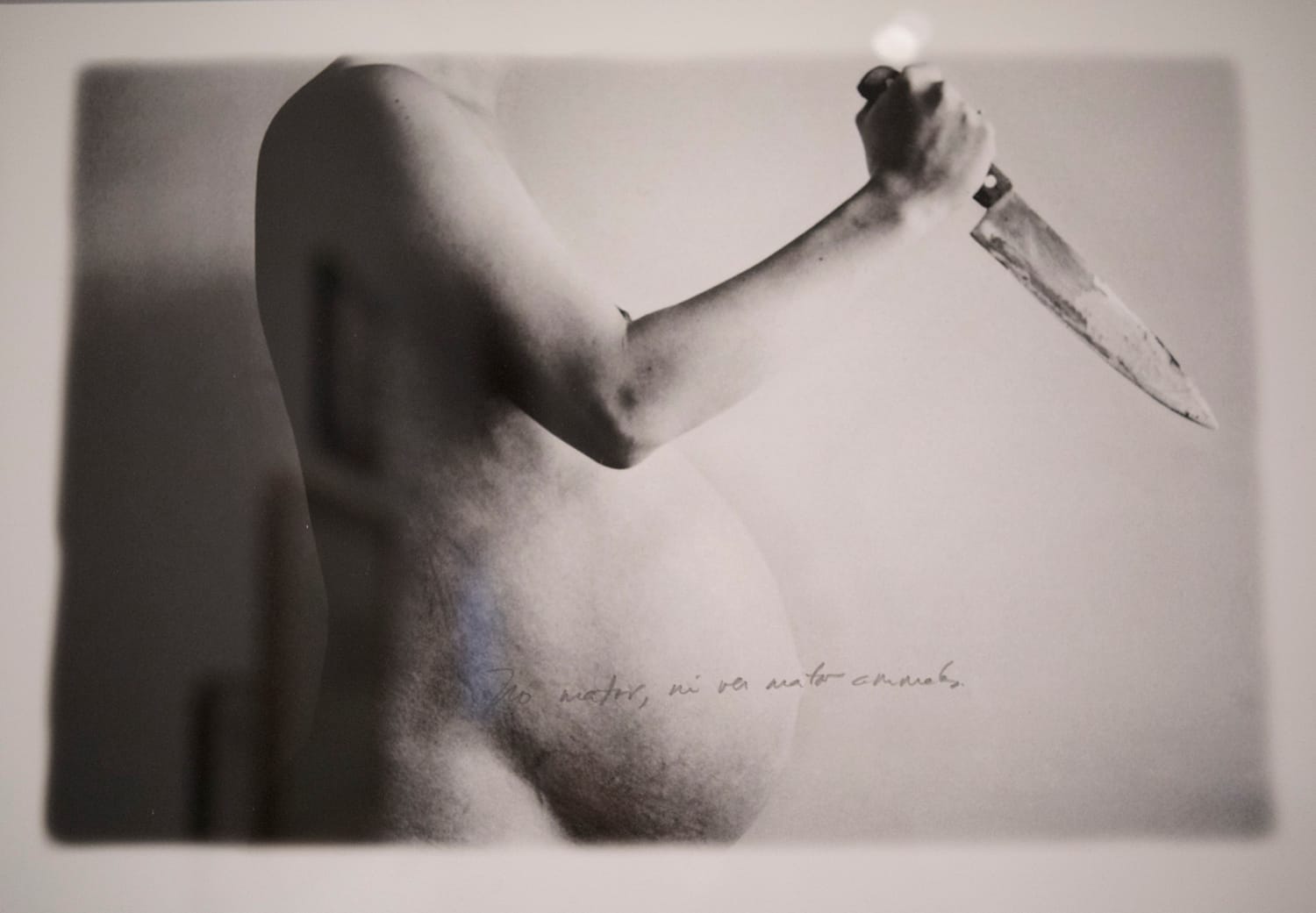 There is Marta Maria Pérez’s “No matar ni ver matar animales (Do not kill animals or watch them be killed)” (1985-86) that depicts the very pregnant torso of a woman in profile holding a large kitchen knife that menaces her belly.