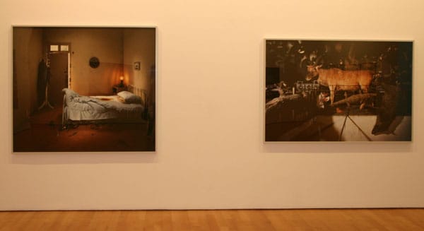 Guo Hongwie’s works on paper combine a focus on American culture with personal history and Chinese cultural tradition. The artist selects and hand paints images from the American psyche, from a portrait of Andy Warhol to a found photograph of the Twin Towers, combining them with his father’s traditional Chinese calligraphy. Chen Wei’s staged photographs of a bedroom have the unnerving stillness and highly produced value of American photographer Gregory Crewdson. Hu Xiangquian’s tone is similarly referential. His video “Art Museum” depicts a presentation by the artist of major Western artworks that have inspired him but that he has never seen or fully understood.