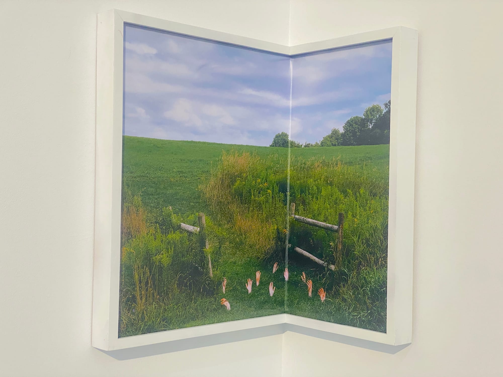Other works queer the way we display photographs. Artist Tommy Kha’s “Article I” (2022–23), made from dye sublimation on fleece, features slices of fruits and vegetables, pieces of cardboard, a can of sardines, and other objects arranged on newspaper. The fleece is hung low on the wall so it folds at a 90-degree angle against the floor. And in Kha’s photograph “Stops (III), Oneonta, NY” (2020), 10 hands reach out from the ground in a lush green field, presumably in the work’s eponymous city. Once again, the photo and frame are installed at a 90-degree angle, this time on the corner of a wall.