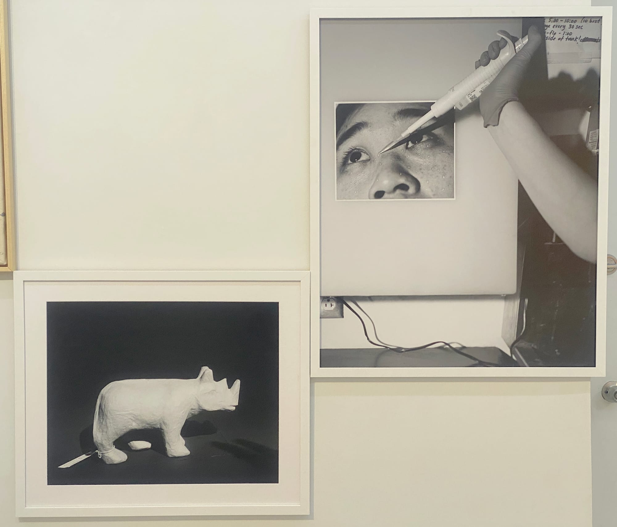 My favorite juxtaposition is Kanthy Peng’s “Artificial Tear” (2019) alongside the artist’s “A Rino Labeled Gay #4” [sic] (2023). In the former work, a hand wearing a latex glove and holding a large syringe drops a tear on a photo of upward-gazing eyes. In “A Rino,” a white clay rhinoceros figure has a tag on its back right foot. It probably doesn’t need the label, but it has one anyway. Throughout the show, queer identity is questioned more than defined, and these works in particular made me think about the identities we can and cannot adopt and tears we can and cannot shed. If straightness implies direction, queerness suggests anything but.