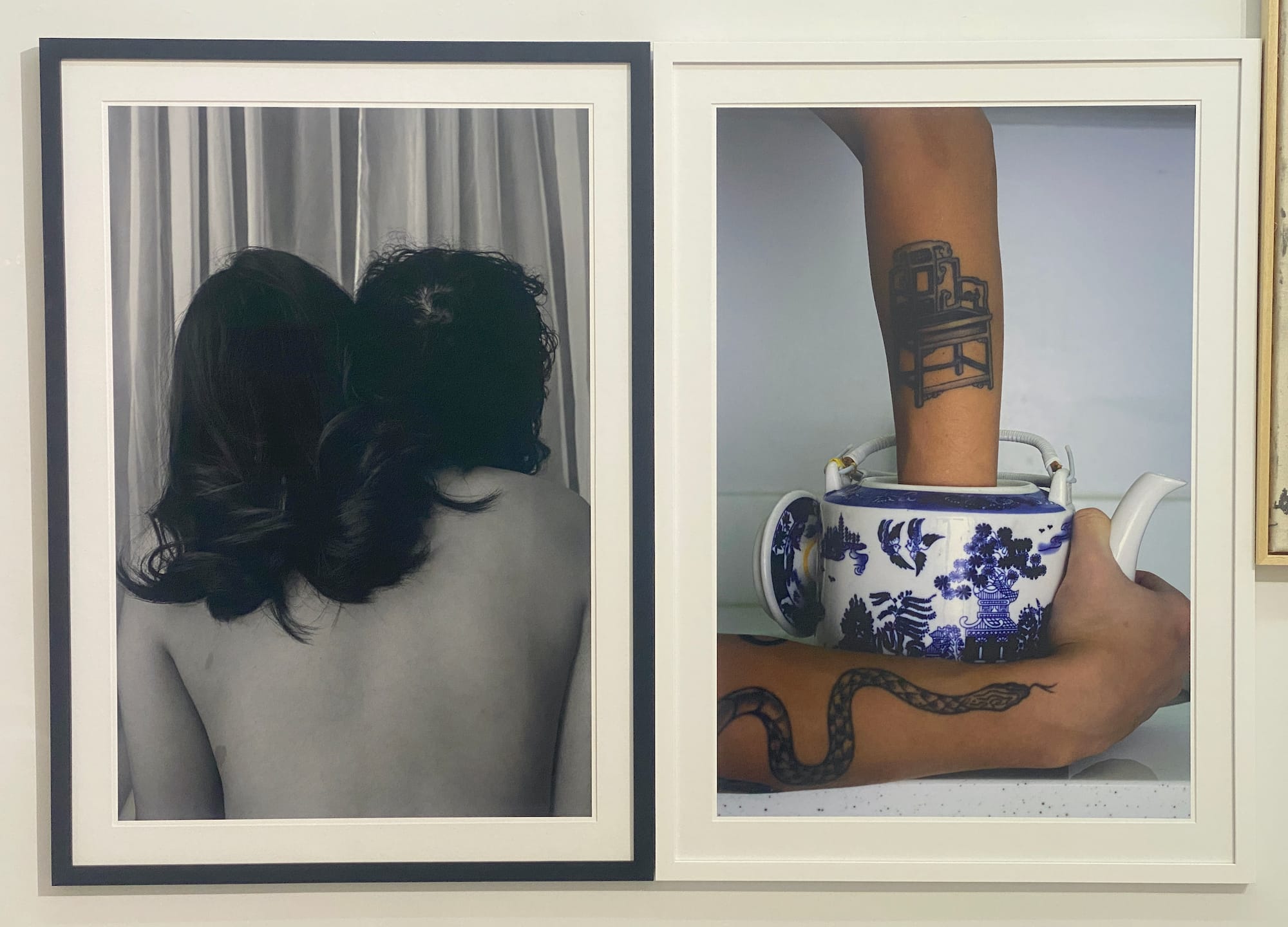 NEW YORK — Two photographs caught my eye at (In)directions: Queerness in Chinese Contemporary Photography, a group show at Eli Klein Gallery through the end of the month. In Alec Dai’s “My Jet Black Hair” (2021), two figures of indeterminate gender appear to rest upright on each other, not quite in embrace and not quite in repose. Their black hair intertwines. The foreground figure faces away from us, their back exposed. In “Pot Fisting” (2021), an arm with a snake tattoo holds a blue and white porcelain teapot by its spout, while an arm with a tattoo of what looks like an antique Chinese chair dives deep into the body of the pot.