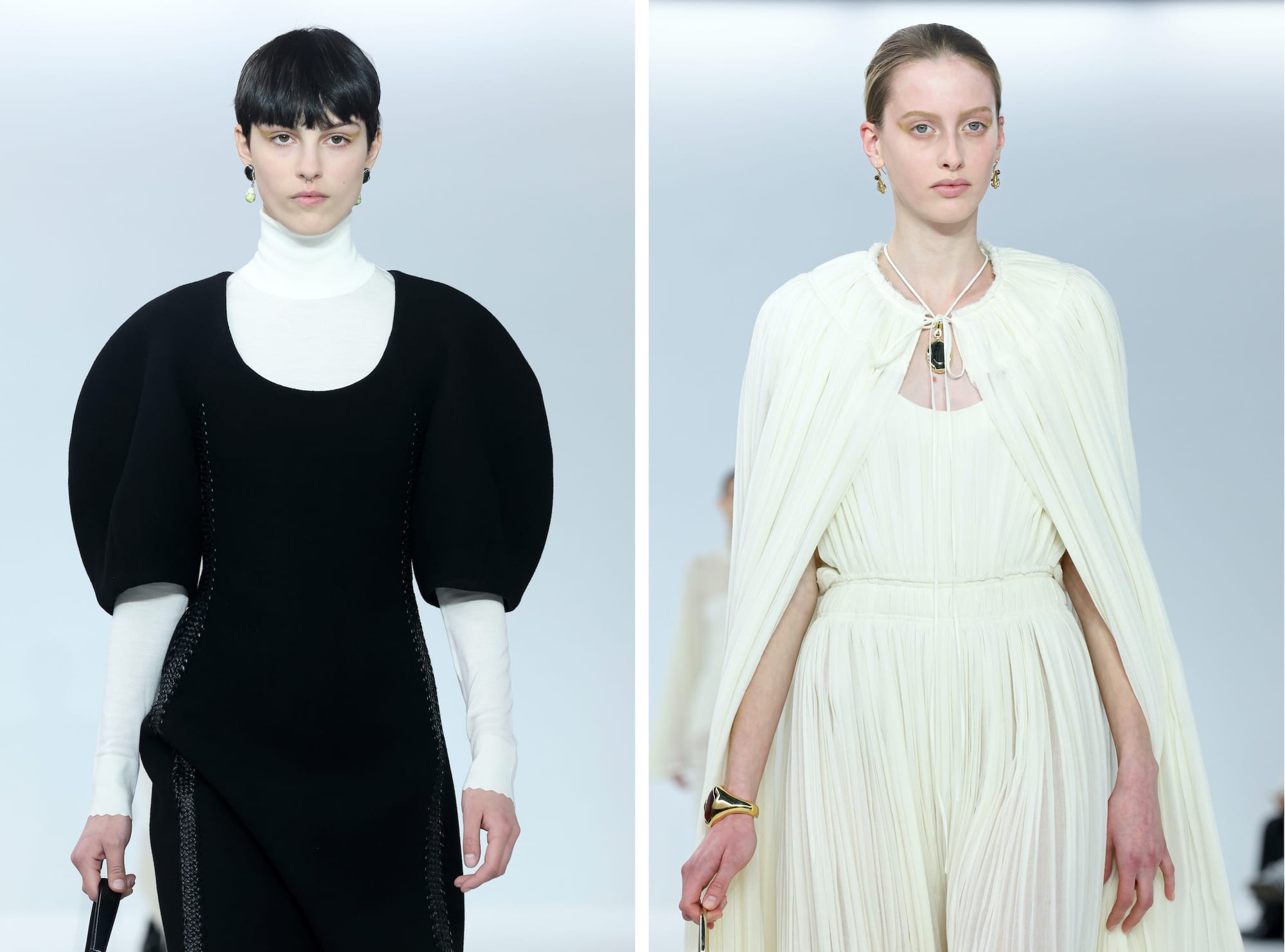 Certainly, Chloé invokes the painter’s name as well as several of her choice quotes in promotional trailers for the line. Perhaps some of the silhouettes could be interpreted as “Renaissance-inspired,” such as the shoulder-baring black dress with billowing sleeves and a prominent bustline, or the gown with a black torso forking into white full skirting in a shape reminiscent of stomachers of the time — and maybe even the structured necklines, shearling collars, and bulky quilting on jackets that are Renaissance in a "Henry VIII" kind of way. But the main thesis of female Renaissance fashion was, as the Leonardo da Vinci portrait of Florentine noblewoman Ginevra de’ Benci asserts in an inscribed motto, “Virtutem Forma Decorat” — "Beauty adorns virtue" — whereas Hearst’s message seeks to harness Gentileshci’s legacy to her theme of empowered female leadership.