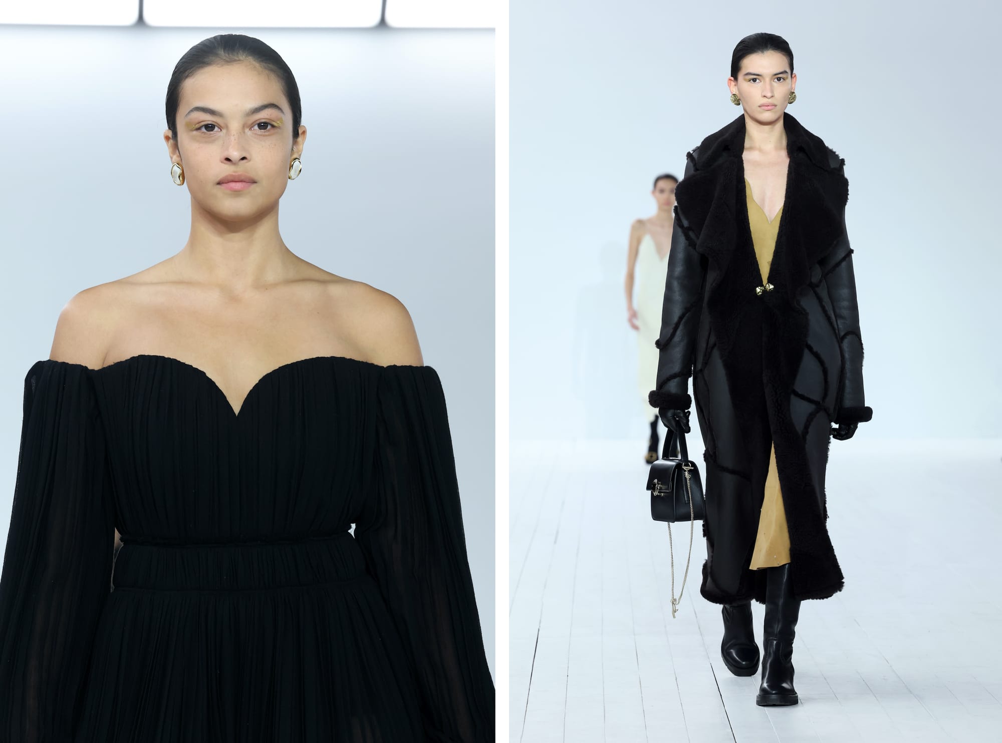 Certainly, Chloé invokes the painter’s name as well as several of her choice quotes in promotional trailers for the line. Perhaps some of the silhouettes could be interpreted as “Renaissance-inspired,” such as the shoulder-baring black dress with billowing sleeves and a prominent bustline, or the gown with a black torso forking into white full skirting in a shape reminiscent of stomachers of the time — and maybe even the structured necklines, shearling collars, and bulky quilting on jackets that are Renaissance in a "Henry VIII" kind of way. But the main thesis of female Renaissance fashion was, as the Leonardo da Vinci portrait of Florentine noblewoman Ginevra de’ Benci asserts in an inscribed motto, “Virtutem Forma Decorat” — "Beauty adorns virtue" — whereas Hearst’s message seeks to harness Gentileshci’s legacy to her theme of empowered female leadership.