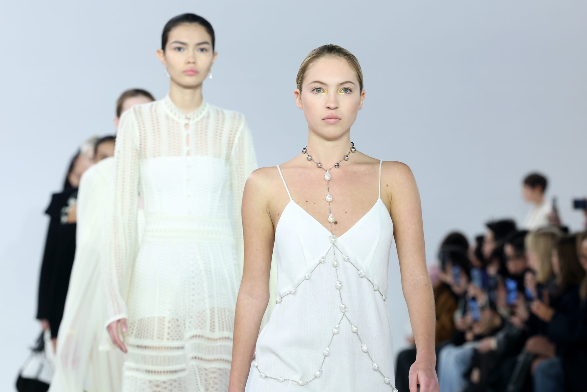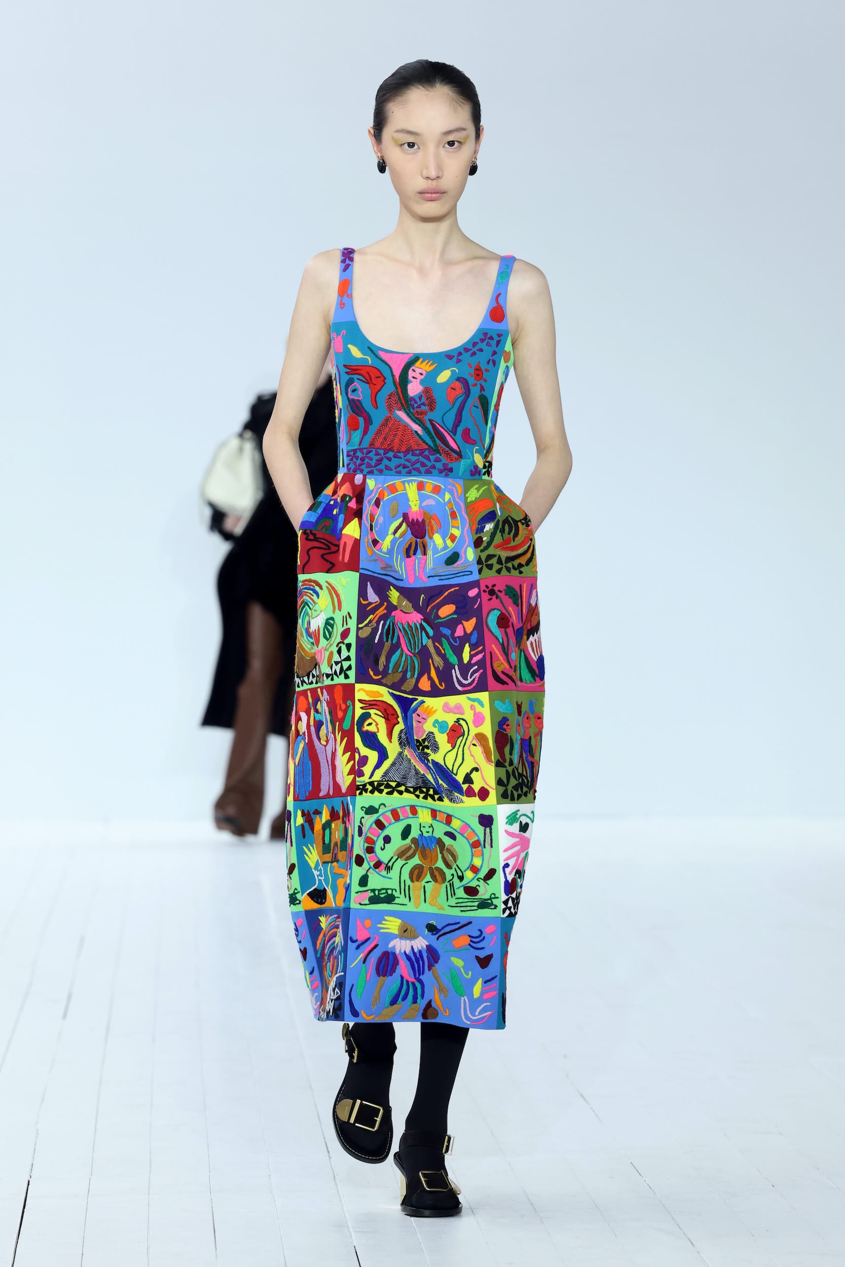 Arguably, the most direct reference to this kind of source material can be found in the collections-only non-neutral-tones piece, an elaborately embroidered dress with informal corset top and patchworked skirt depicting scenes of intrigue and perhaps violence (there seem to be some floating heads in there, whether the result of artistic gesture or decapitation is for you to decide). This stands out in such sharp contrast to the rest of the collection, which offers little narrative, though certainly a wearable array of lacy dresses, knitwear, and patchworked leather — one of which was worn by Quannah Chasinghorse, an Indigenous and tattooed model who was born into the Navajo Nation in Tuba City, Arizona, and who probably has as much to say about making a career as a standalone figure as Artemisia Gentileschi did.