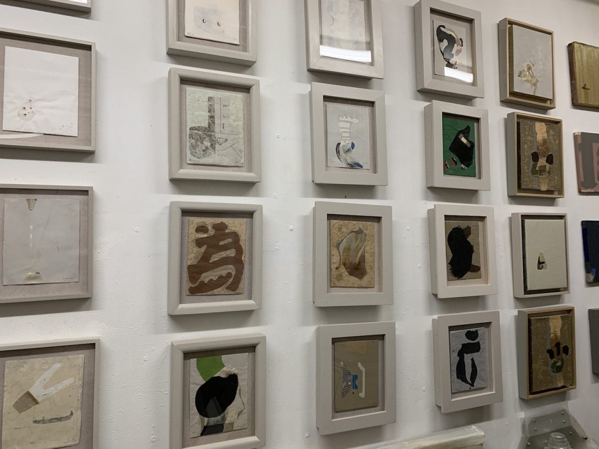 Behind me, on the wall, he had hung four rows of drawings. Some were calligraphic, but, unlike ink drawings, they were made over time in oil paint and other materials. He seemed to want to slow time and consider the relationship between nature and society. He showed us a drawing of a hand and talked about his mother, who died when he was young, and a particular memory of an old Korean children’s song that has the line, “Hey toad, hey toad, I’ll give you an old house, you give me a new house….”