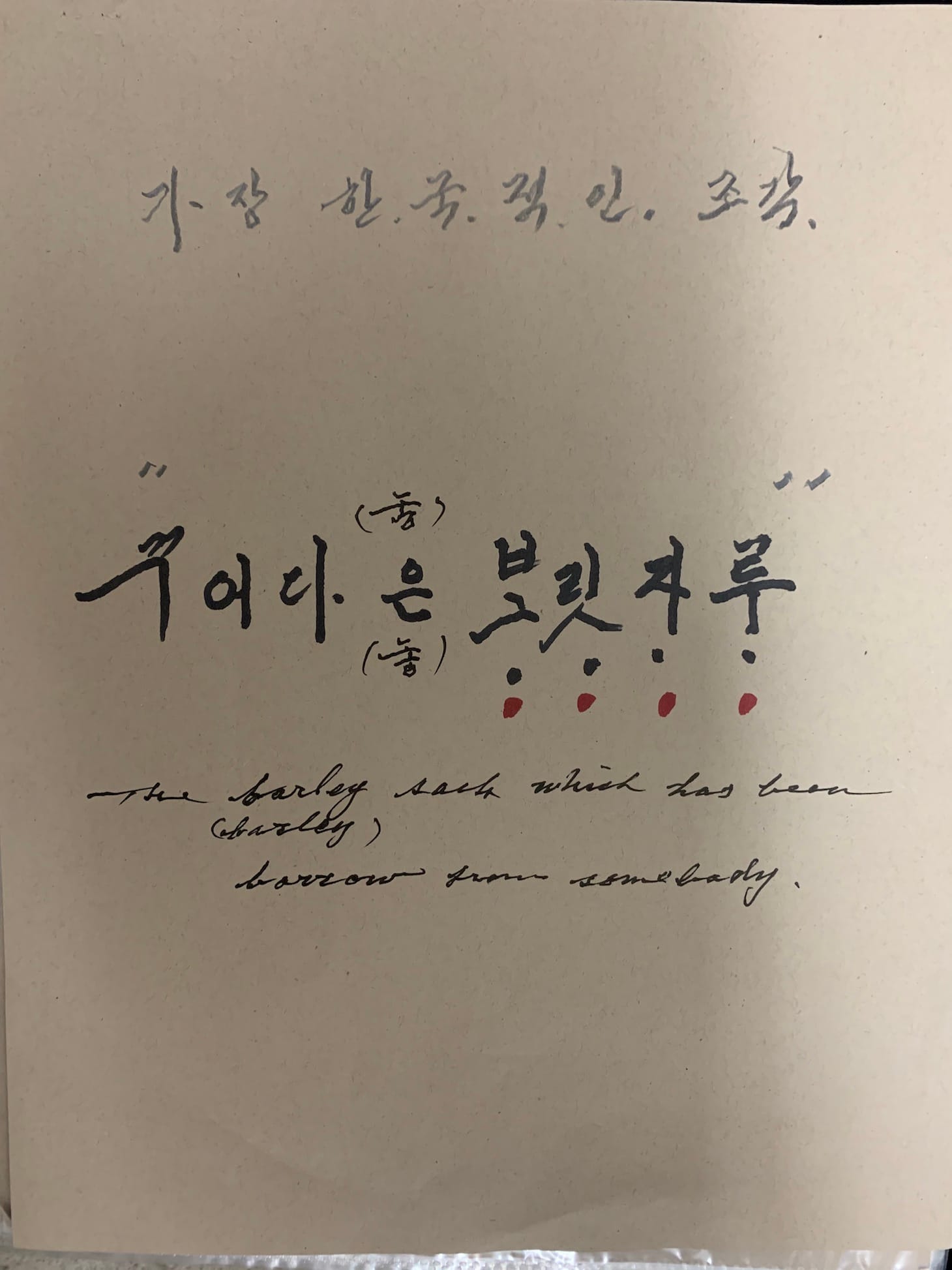 According to Lee, children usually sing this song while playing with soil: putting the soil onto their hands, making it firm, and then drawing their hands out of the soil. She also translated what Lim had written on the drawing: “It is a toad’s house when you take your hand out from the soil; this is a sculpture that I made with my mom.”