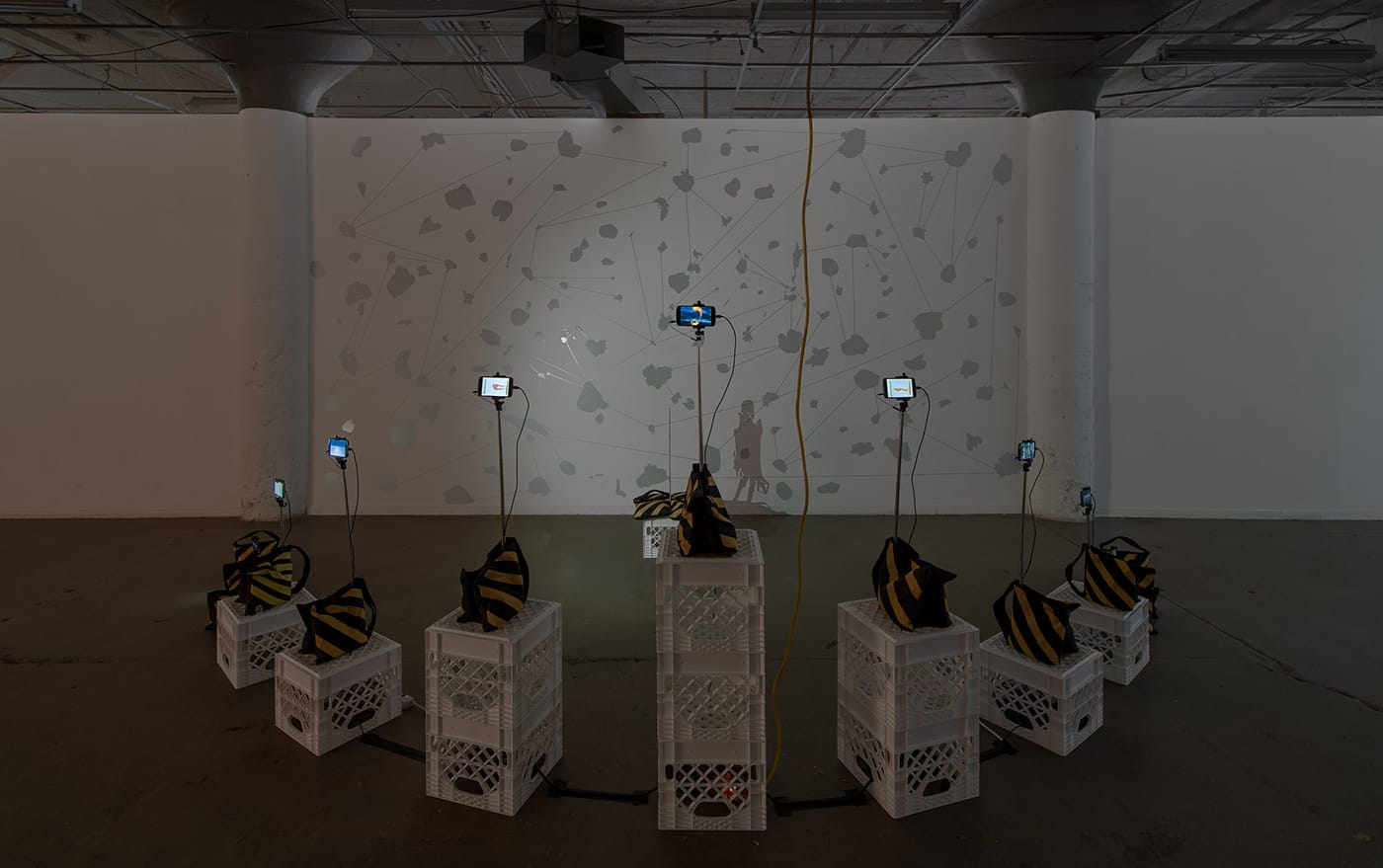 Many of Reilly’s recent projects have dealt with intimacy and interpersonal relationships, so it’s interesting to see him working solo here. He’s the lone subject of all the show’s works, which encompass glitchy video collages, reflective wall decals, and a semicircle of Android camera phones organized into a sundial of surveillance. They represent a kind of progression through the ideas that have been floating around in his artistic atmosphere for almost the last decade. Among those are his thoughts on personal surveillance and self-monitoring, outlined in an article he wrote for Geez magazine in 2009, and a number of incomplete projects begun during a residency at the Samband Íslenskra Myndlistarmanna in Reykjavík, Iceland, in 2015.