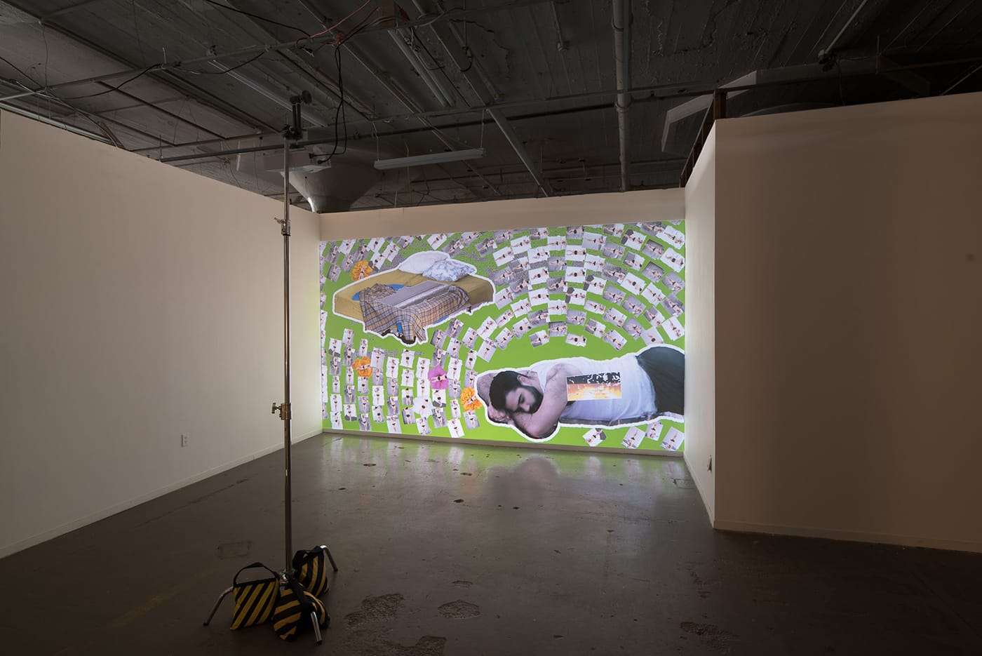The first piece you encounter, “Self Portrait in Reykjavík” (2015) is a roughly two-minute looping video that superimposes scraps of footage gathered during Reilly’s time in Iceland — particularly of barges moving across a sunset seascape — on a glitchy, animated self-portrait from the shoulders up. Reilly has applied some kind of transparency to aspects of the self-portrait, so the cut footage sometimes obscures his image. The work shows Reilly asleep in bed — the exhibition’s major visual theme — and treats his own form as a digitally matted object, cut from surrounding context and set against a solid background. Reilly is treading in the experimental space of attempting to capture or replicate dream states, synesthesia, and body clocks; the video is almost a thesis statement for the exhibition, setting up a surreal and prolonged meander through the artist’s Circadian rhythm.