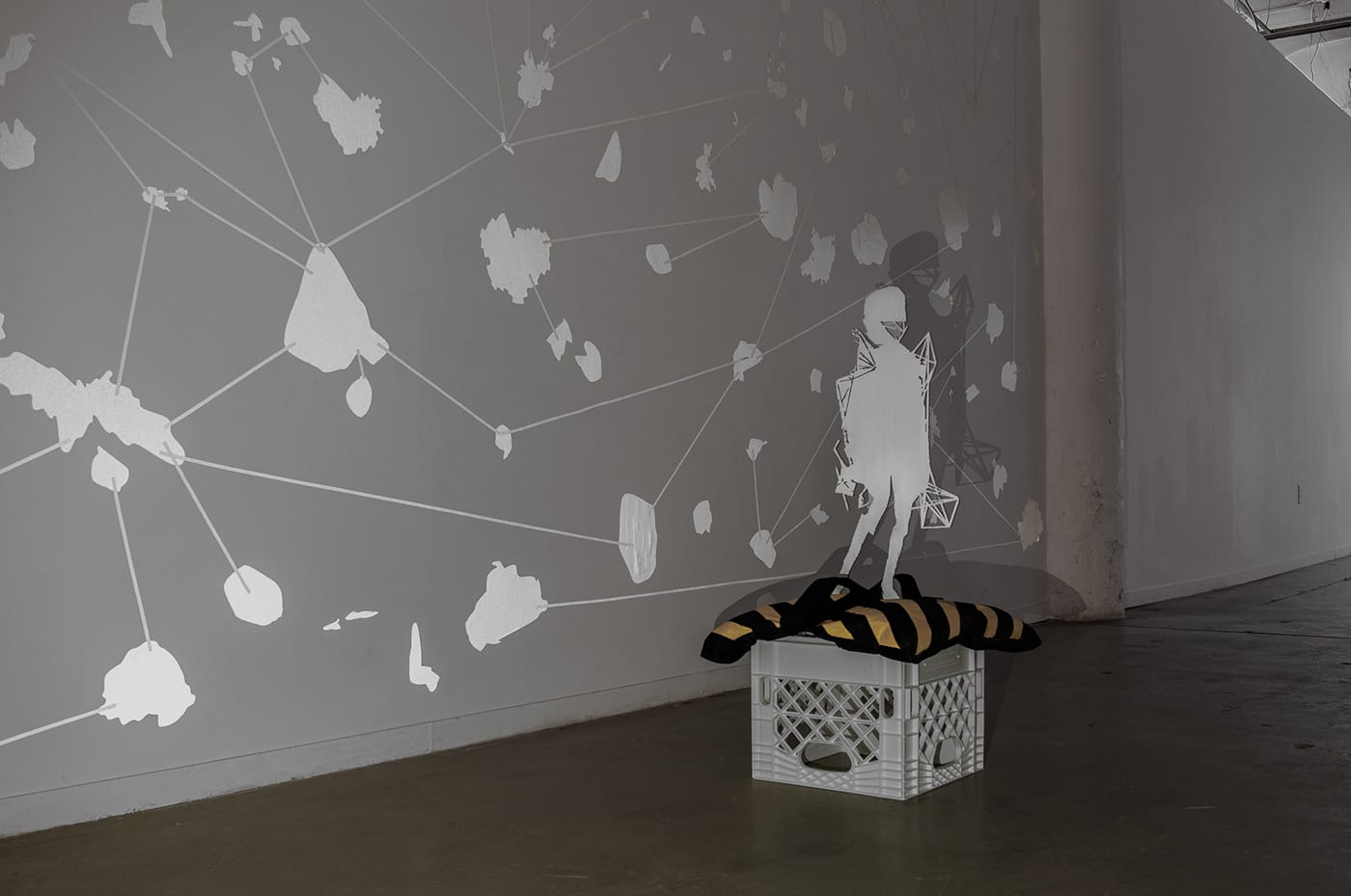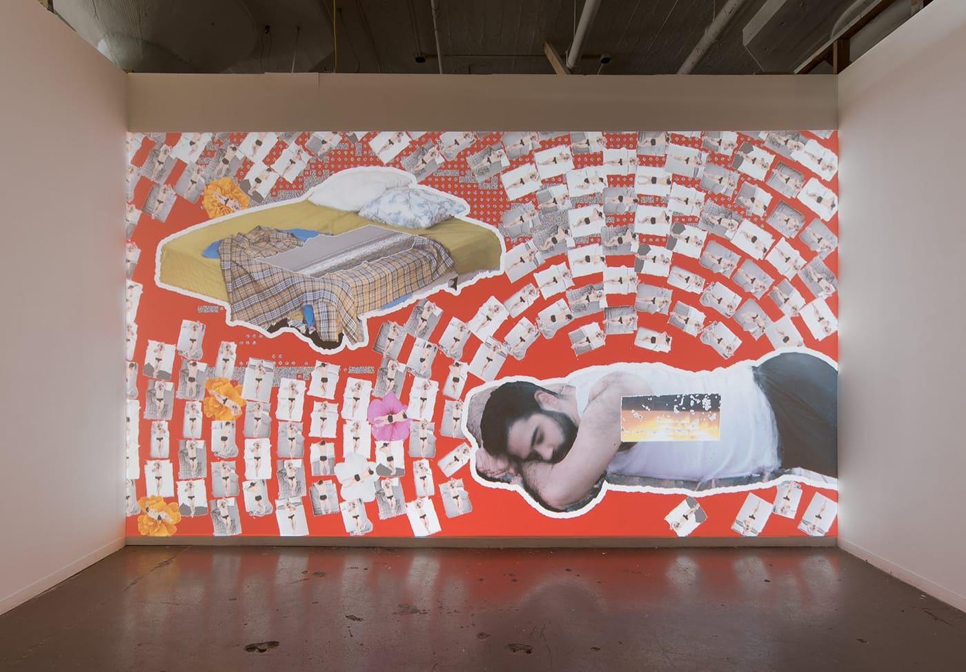 For, in Reilly’s world, no one is an island — even the computer-generated islands on the wall are connected like a family tree. Self-portraiture is employed to showcase the artist in his most open and receptive states. Reilly uses his tools to make vulnerable, hand-cut constructions, or digital quilts, as he calls them. The work suggests there are no such thing as “scrap” ideas or wasted effort, but rather pieces of a wider network whose logic hasn’t quite resolved. One could attempt to force the connections, or, as Reilly has done, one could yield interesting results by first sleeping on it.