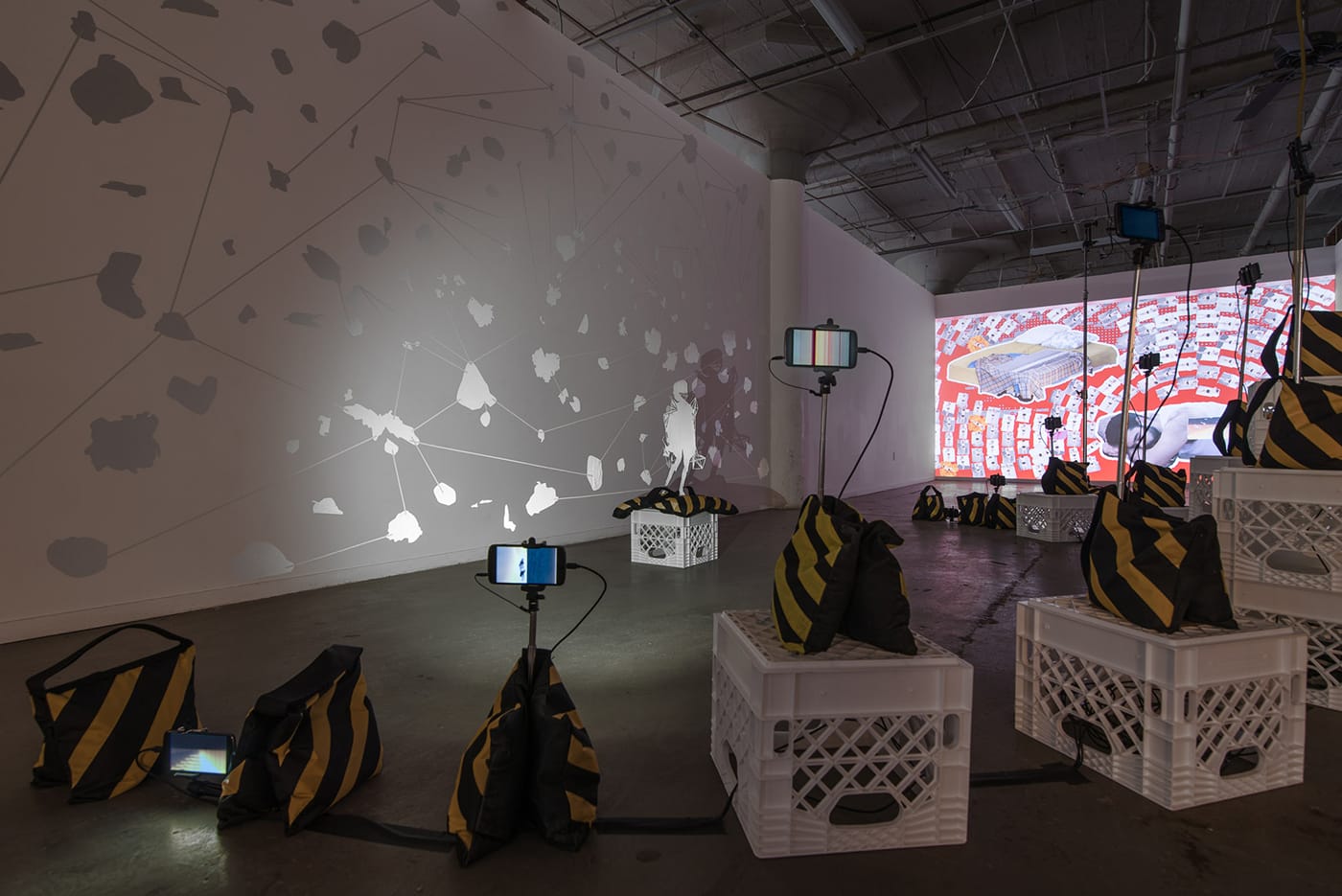 Two works form the centerpiece of the show: “Analog Clock/Dreamcatcher,” a map of computer-generated island forms rendered in reflective vinyl stickers, and a “body clock” of Android phones mounted on selfie sticks, each playing fragments of videos — largely self-portraits of Reilly in repose — and occasionally emitting light that activates the reflective surfaces of the islands. These are an iteration of Reilly’s “Islands Game,” a collaborative drawing exercise that asks participants to connect the shapes with lines. Some are also the products of an island-shape-generating piece of software that Reilly created, a terrific example of his paradoxical efforts to codify randomness. The island map reflects light only in pieces, suggesting a neural network of floating-yet-connected ideas and emphasizing the sense of ordered chaos.