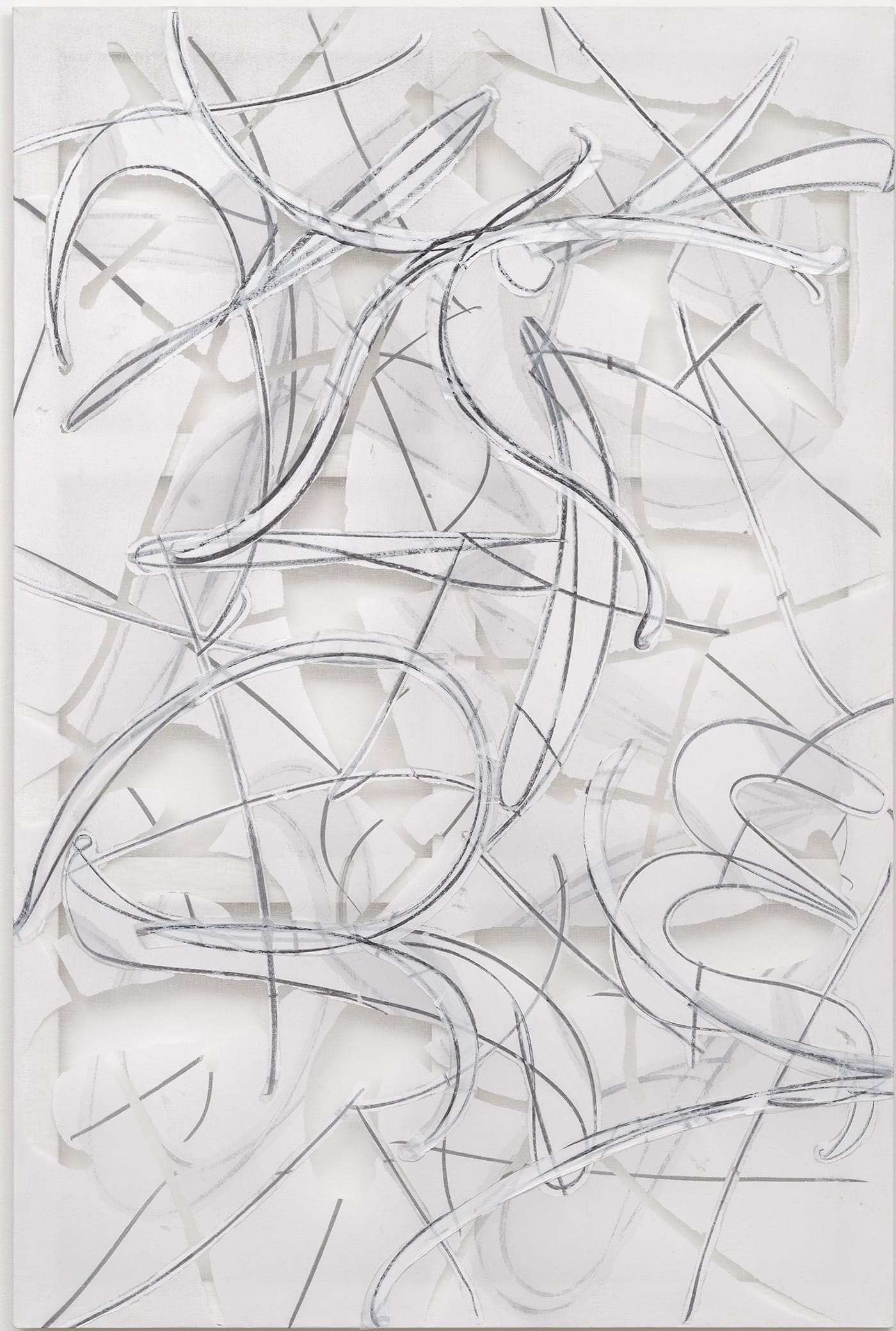 The result is a painting conceived as a see-through screen where the stretcher bars and the wall behind them peek through the surface and are present in the viewer’s mind as part of the overall image. Blank, unpainted areas, reminiscent of the patches of bare canvas that Cézanne left in his late work, establish an unexpected breathing room between painted surface and physical space.