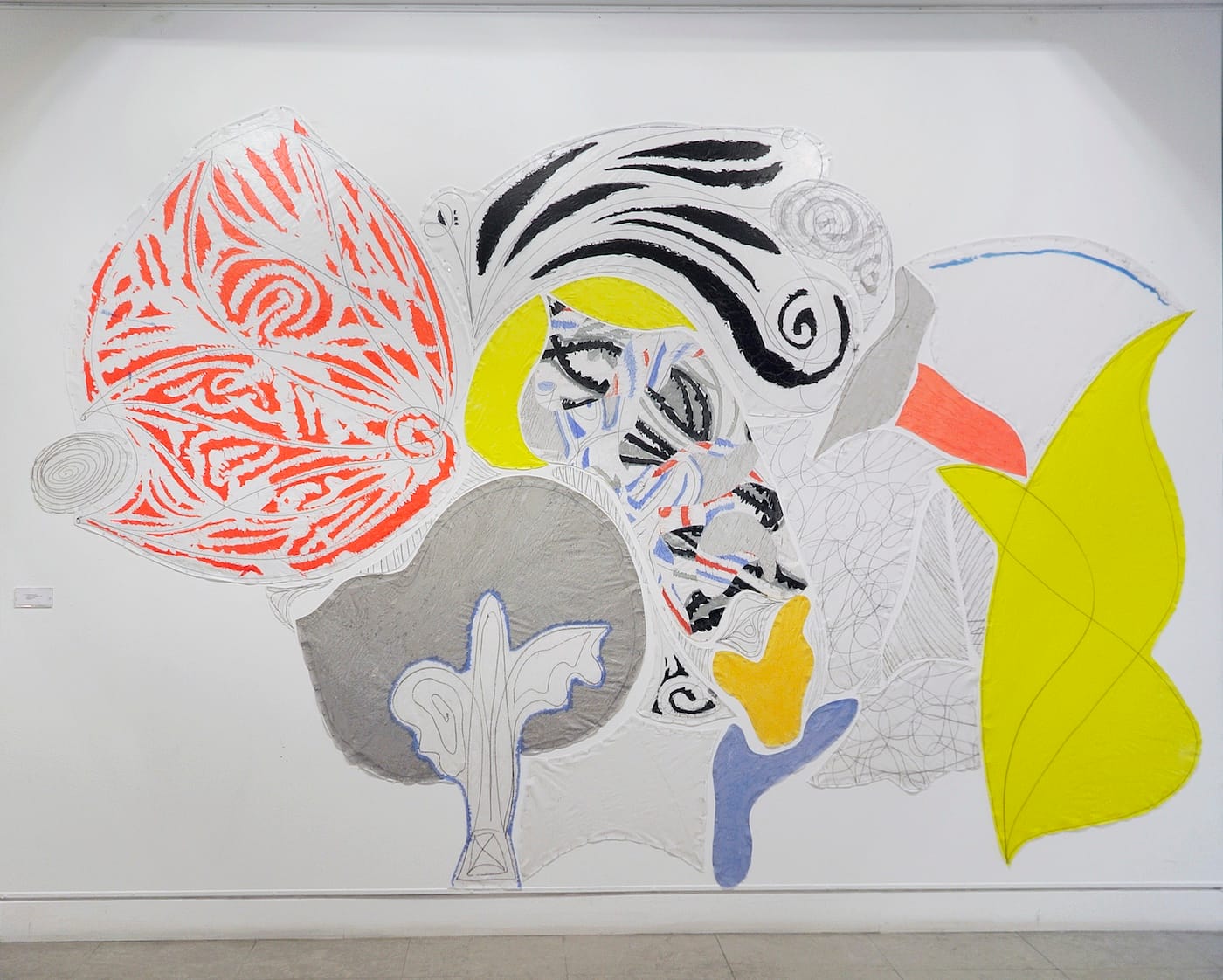 Around 2000, in parallel with his production of paintings on stretchers, Bonnefoi started to work directly on the wall, first with the Ludo series and then with the Compositions (2009-2014). The shapes previously superimposed in his collage paintings were now unfurling into the realm of montage, with pre-painted cut-outs pinned to the wall, redistributing the function of the pin within the economy of the work.