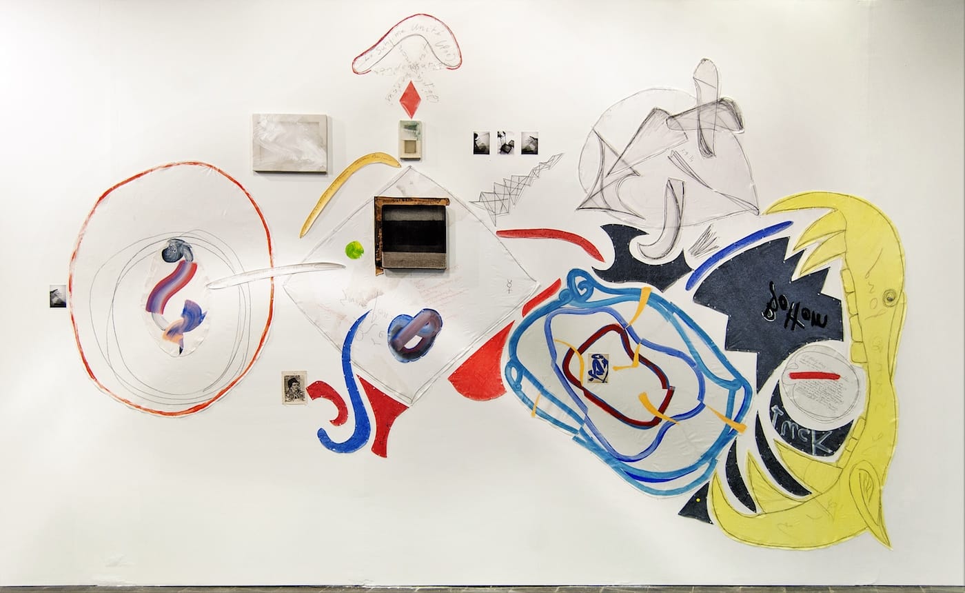 These recent mural pieces also proved to loosen up a practice that was tightly closed, in terms of its self-referential methodology, to allusions of the figure and of the written word. While it may be difficult not to think of Henri Matisse’s “Deux danseurs” (1937-38) in Paris’ Musée National d’Art Moderne (an early paper cut-out riddled with thumbtacks), as Bois pointed out in his 1992 text “The Pin,” Bonnefoi’s use of the pin as a collage device owed as much to Picasso’s painted pins in his early cubist collages from 1912-13 as it did to Matisse.