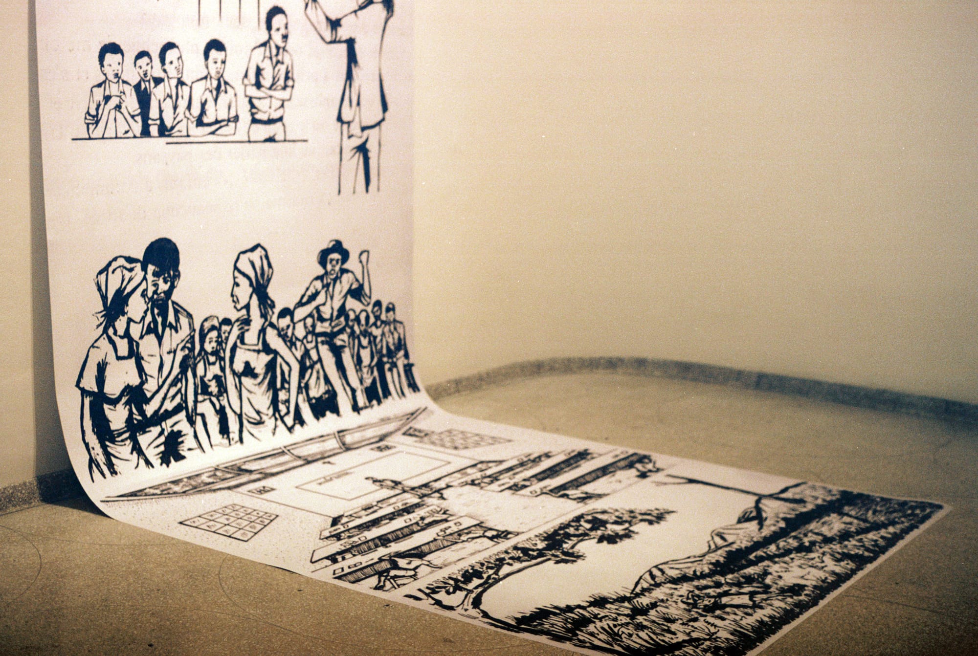 Ousmane Sembène, the august “father of African cinema” would often refer to films as cours du soir, or night school. His belief in cinema as an accessible form of public education is one shared by the artist Christian Nyampeta, who has transformed the Guggenheim into a space for collective study, displaying works of his own alongside others that examine Pan-African colonial histories with textbook-like reserve.
