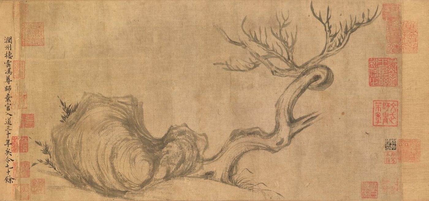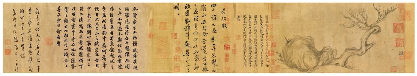 “Wood and Rock” is an ink-on-paper scroll depicting withered tree branches alongside a warped and winding rock formation. The painting is part of an extended scroll with calligraphy by Mi Fu — a renowned contemporary of Su.