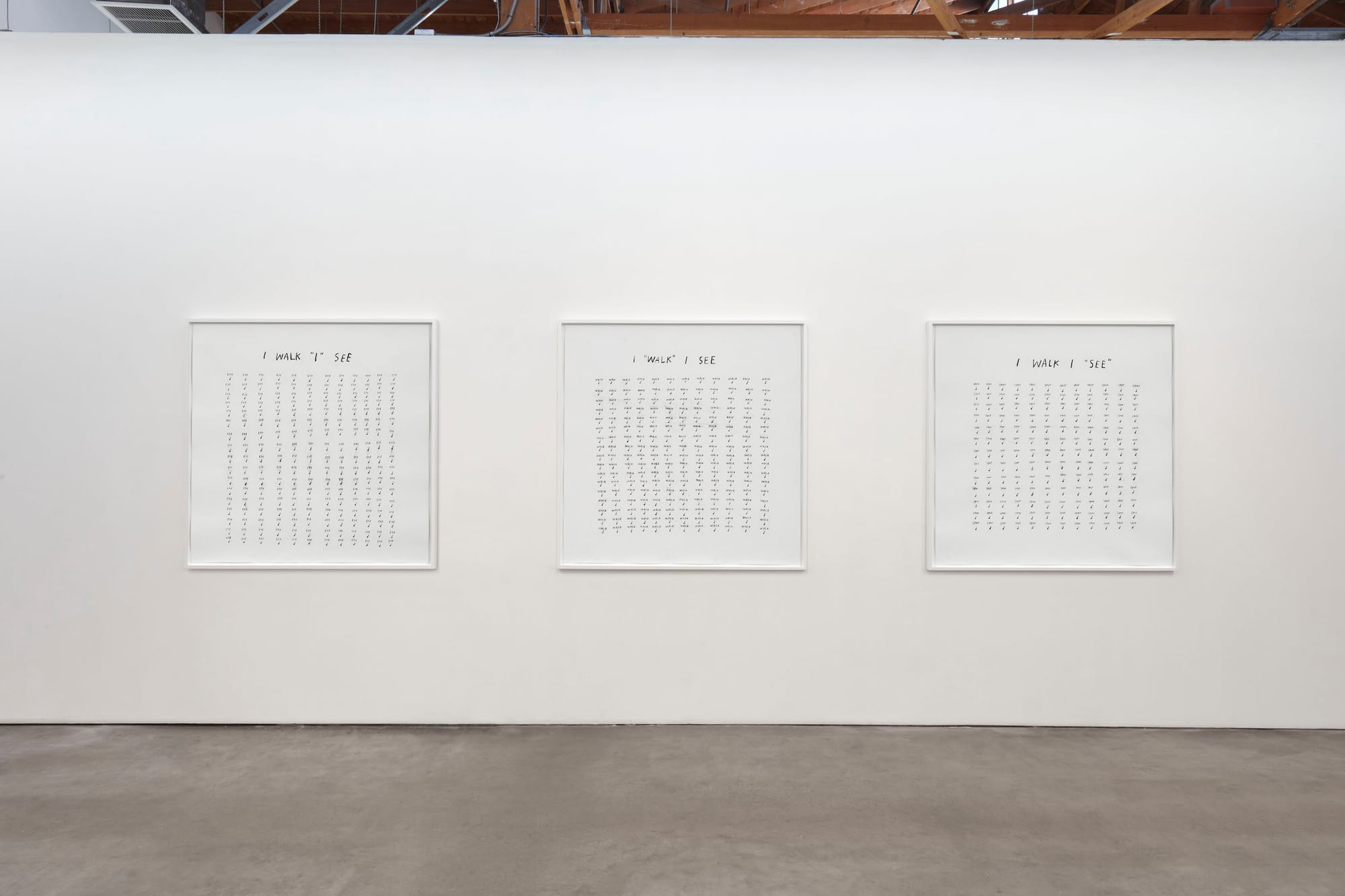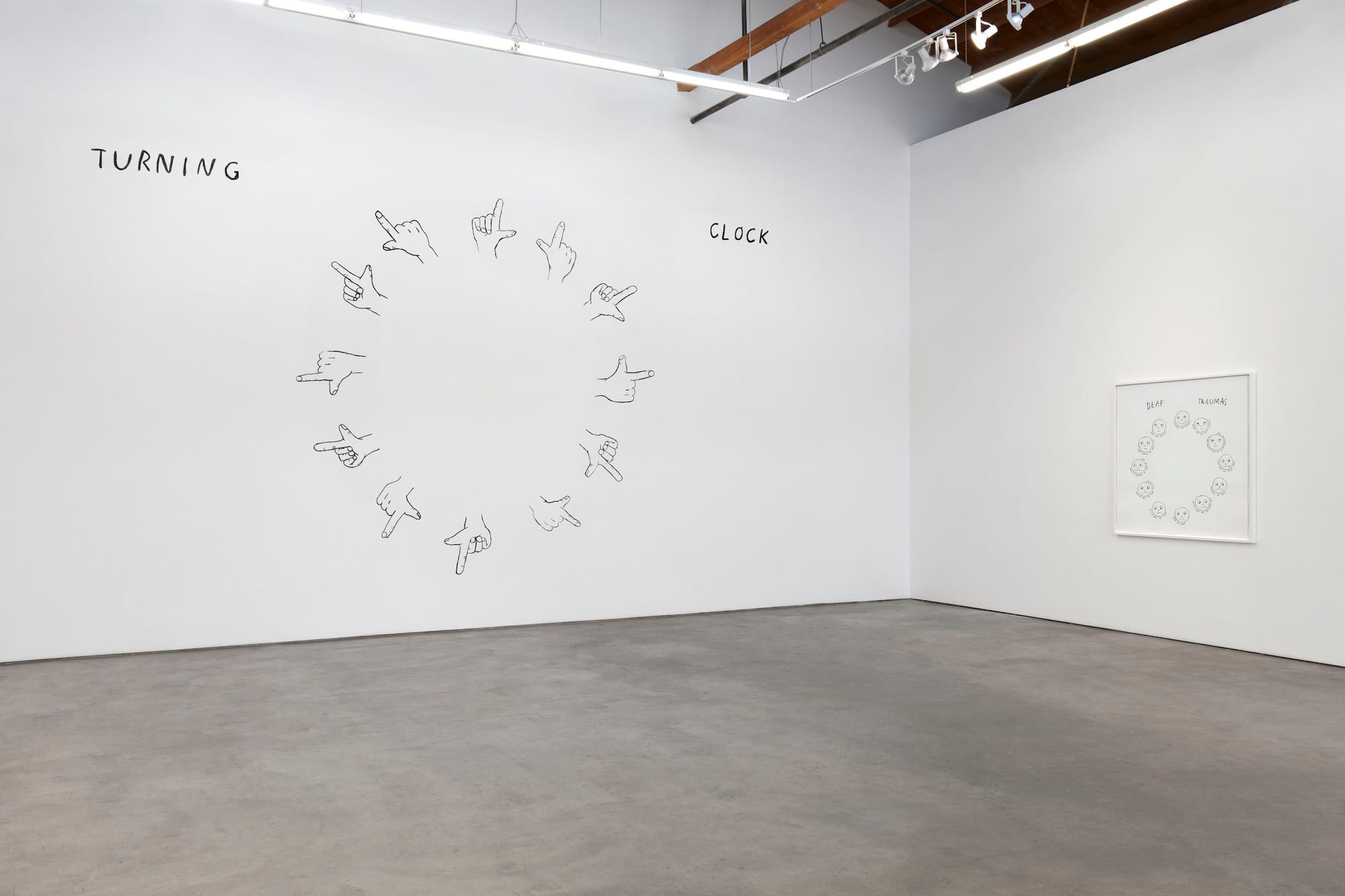 The artist’s sense of playfulness imbues the physical gallery space. For example, “I Walk I See” (2020), a triptych drawing out each word in its title — “I” (eye) / “Walk” / “See”— transcribes the rhythm of the viewer as they approach the trio of drawings and walk past. Moments like this are found throughout the exhibition, such as the pairing of the mural “Turning Clock” with its smaller counterpart, “Now Your Turn,” placed directly across from each other. Kim’s careful attunement to space not only suggests that the artist treats the gallery as another visual system of information, but the viewer as one as well, to be directed to action.