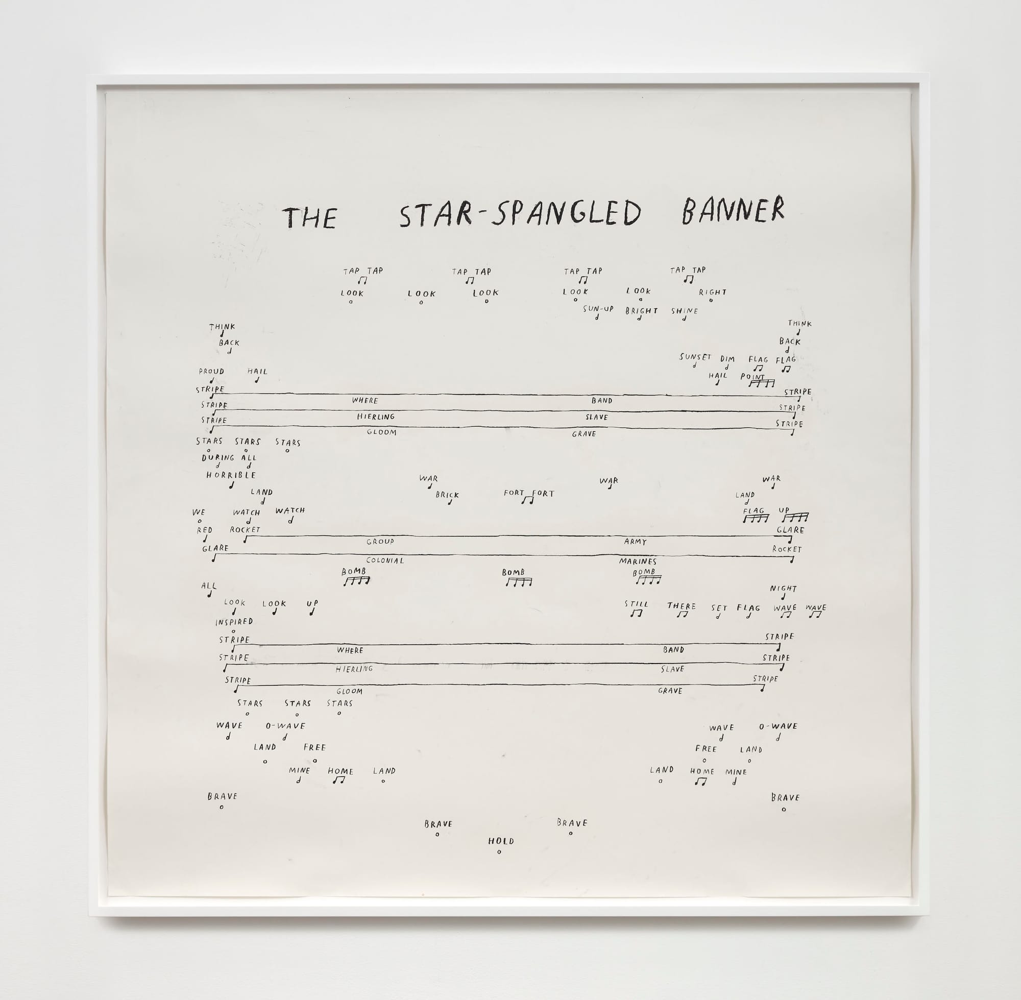 The show opens with two drawings that illustrate the expansive boundaries of the artist’s imagination: “America the Beautiful” and “The Star-Spangled Banner (Third Verse).” Half concrete poetry, half physical documentation, both drawings reference the artist’s iconic ASL performance of the anthems last year at the Super Bowl. The Star-Spangled Banner’s opening line “O say can you see” is interpreted as “tap tap” and “look,” repeated in a line across the top of the white paper. The paper itself, spanning an arm’s length, almost serves as a physical notation of the motions of the words in ASL, the charcoal smudges a record of the artist’s hand in action. Put another way, Kim’s works can be viewed as exercises in both translation and transcription, crisscrossing languages of the body, of music, and of words.