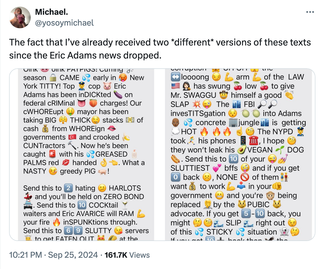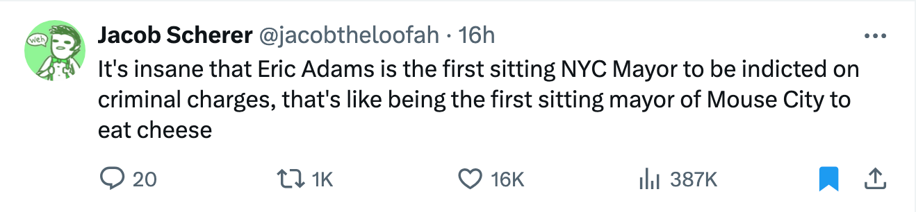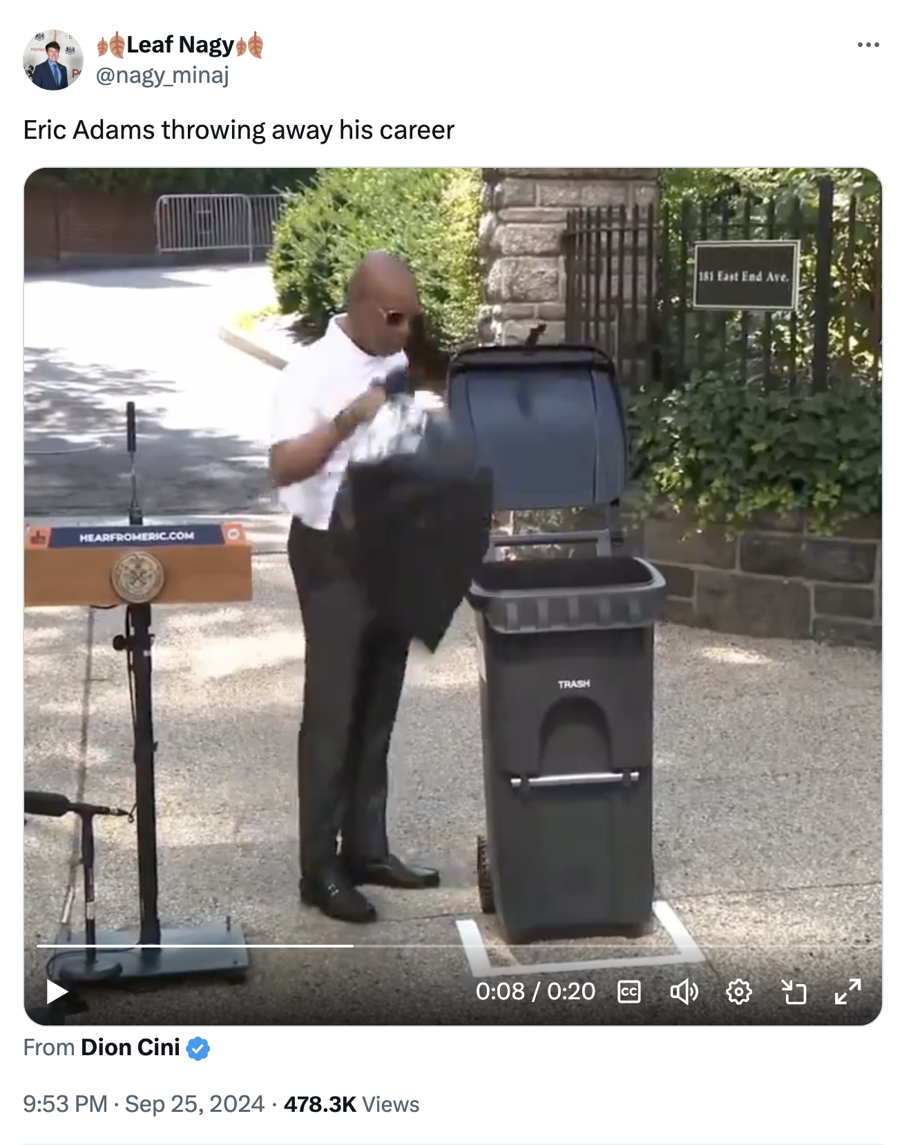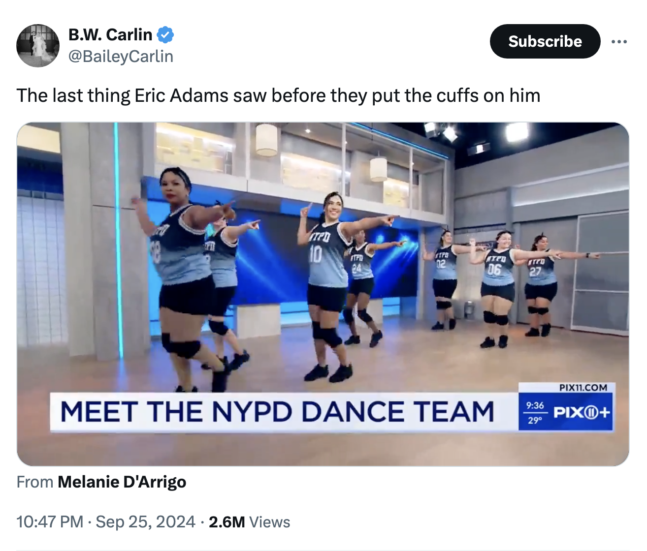So I wouldn’t say I was feeling surprise so much as resignation when the news broke last night that Mayor Eric Adams had been indicted on federal charges. And oh, yeah — I was fucking delighted. Adams has actively exacerbated homelessness in New York City. He's engaged in and stoked racist rhetoric toward migrants and cracked down on student protests, all while allegedly misallocating contracts — that is to say, he is both cruel and incompetent. He's increased policing, which has obviously disproportionately targeted Black and Brown people. For Christ's sake, he tried to cut the library budget. Goodbye (hopefully). Good riddance.