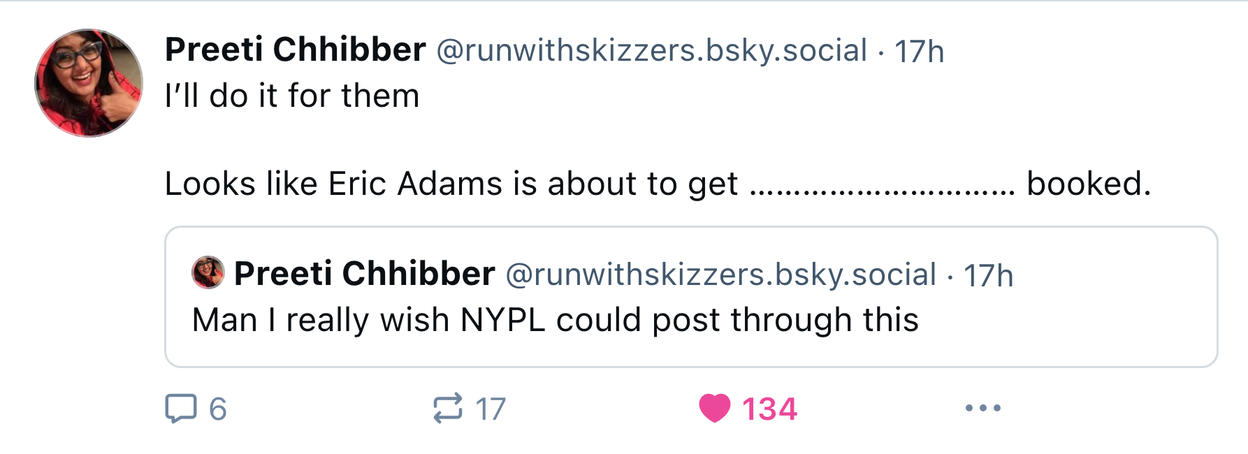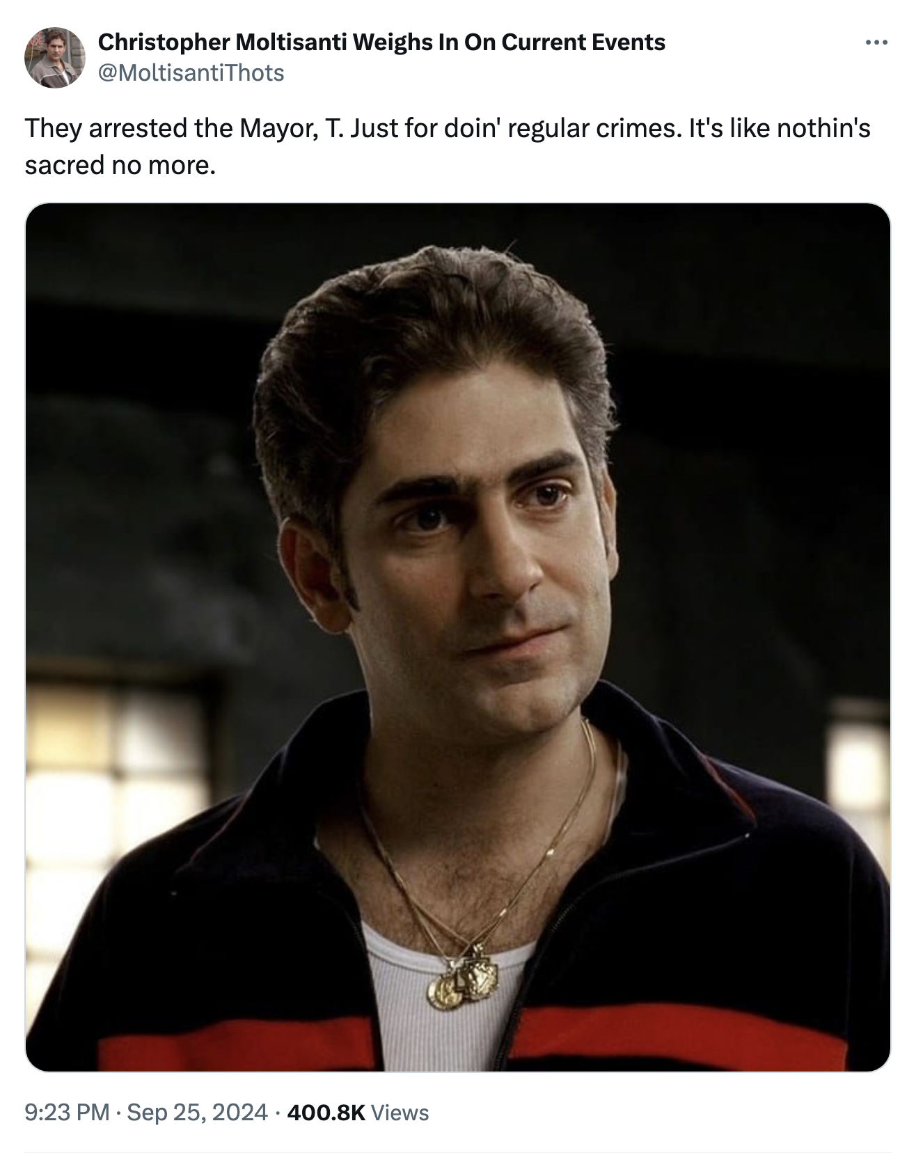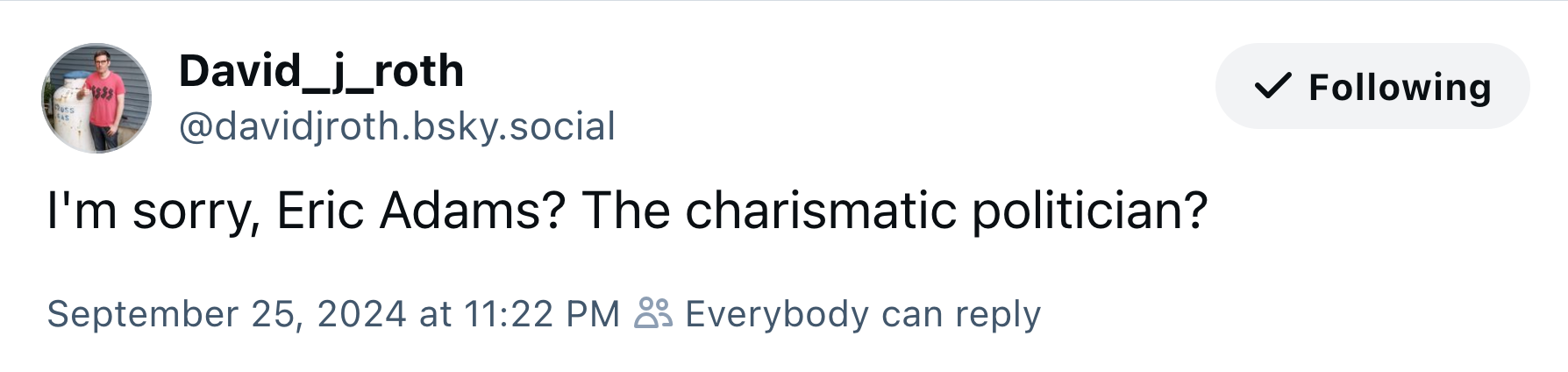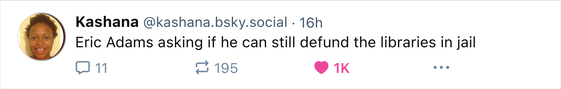 So I wouldn’t say I was feeling surprise so much as resignation when the news broke last night that Mayor Eric Adams had been indicted on federal charges. And oh, yeah — I was fucking delighted. Adams has actively exacerbated homelessness in New York City. He's engaged in and stoked racist rhetoric toward migrants and cracked down on student protests, all while allegedly misallocating contracts — that is to say, he is both cruel and incompetent. He's increased policing, which has obviously disproportionately targeted Black and Brown people. For Christ's sake, he tried to cut the library budget. Goodbye (hopefully). Good riddance.