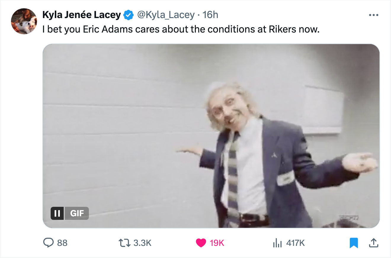 A vast number of these memes specifically target Adams's mayoral record. I approve; speaking as a critic, our hating must be couched in tangible evidence, such as his failure to improve — or even admit to — horrific conditions in the Rikers Island jail.