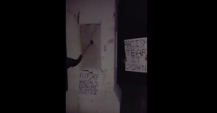 Video footage showing someone taking a sledgehammer to the memorial's base was posted on Popular Resistance's YouTube channel this morning.