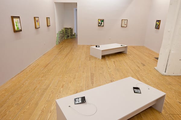 If the casual viewer doesn’t consult the price list, he won’t know that a fictive character, Hirsch E.P. Rothko (HEPR), is partially credited for the paintings, impossibly dated both 2001 (Rothko) and 2010 (Ho). On his way out, he might pick up a copy of Hirsch E.P. Rothko (2001/2010) by HEPR, hundreds of copies of which are neatly stacked against the wall. He probably won’t read it.