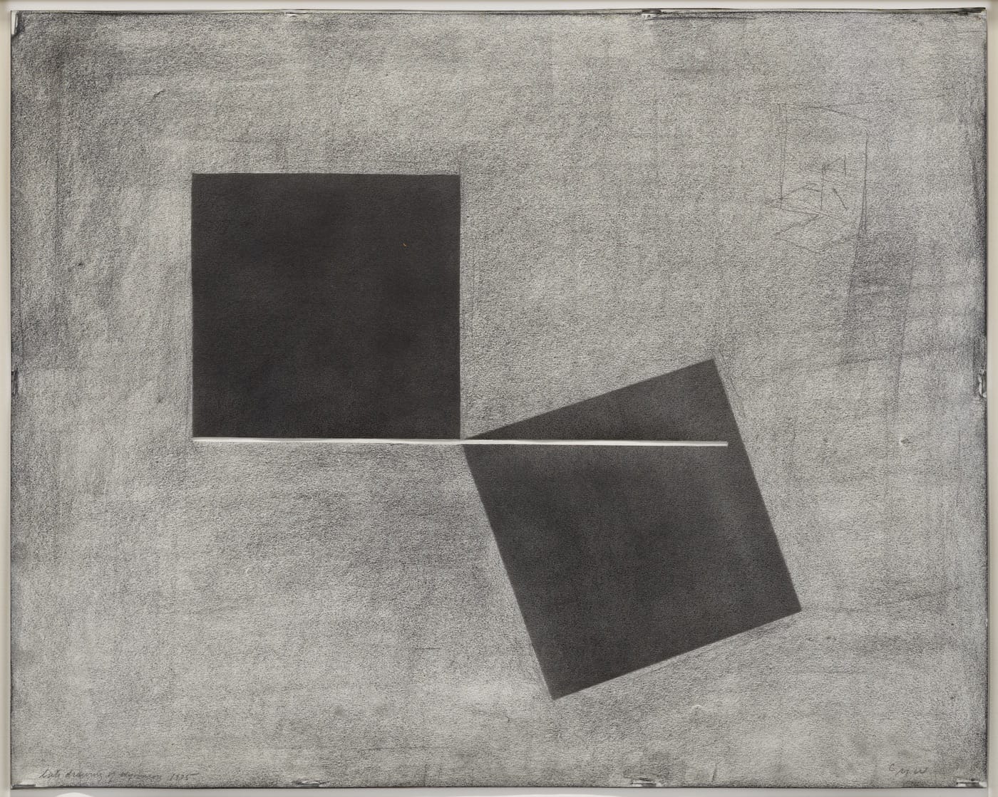 And “INVITATION #3” (1975-76), the only floor piece in the show, consists of a pane of etched glass conjoined with a steel plate. Wilmarth’s drawings, of which “Late Drawing of Wyoming” (1975), made with graphite on layered paper with staples that are gorgeous in their own right, is a good example, were used to plan his sculptures.