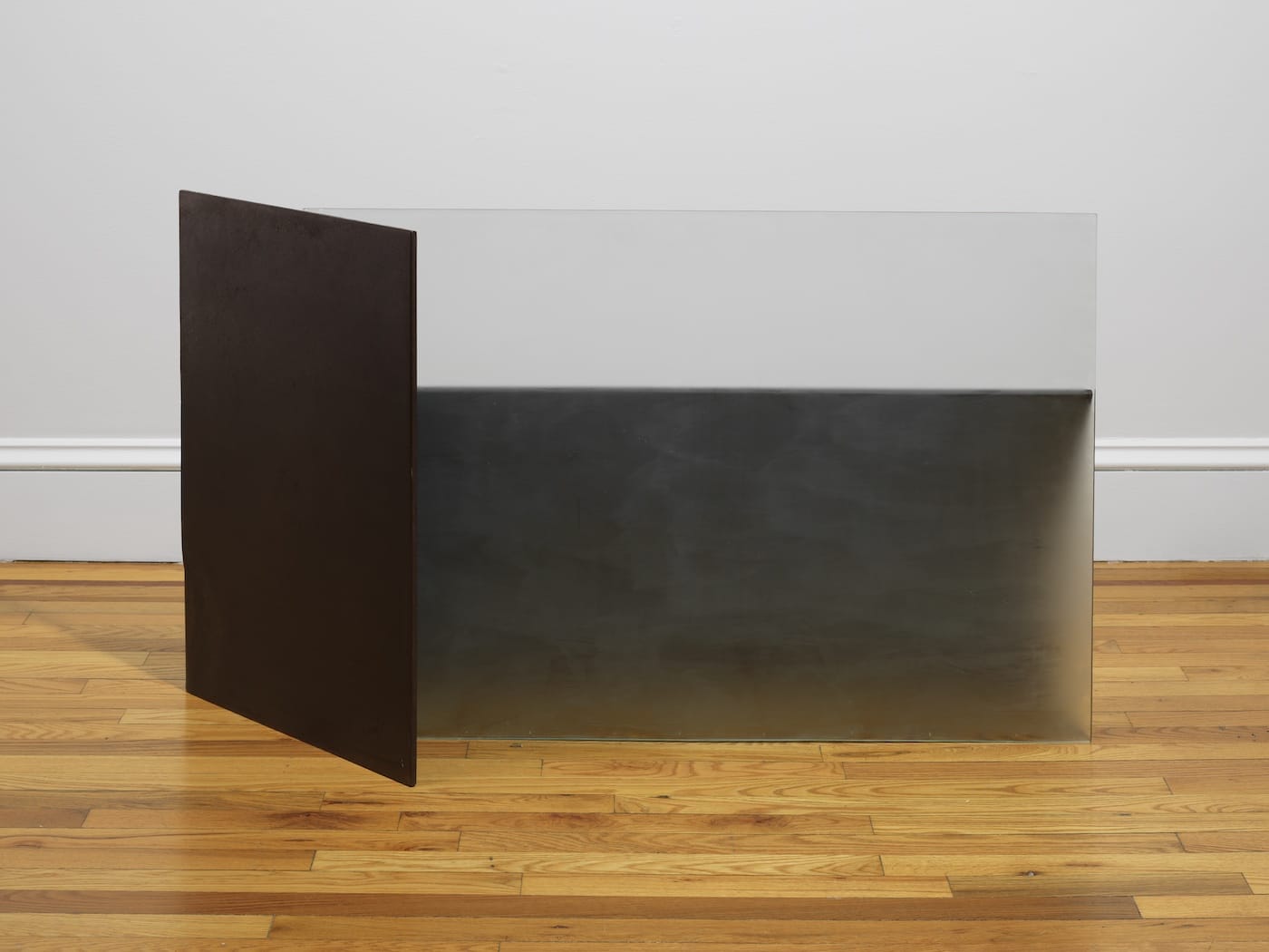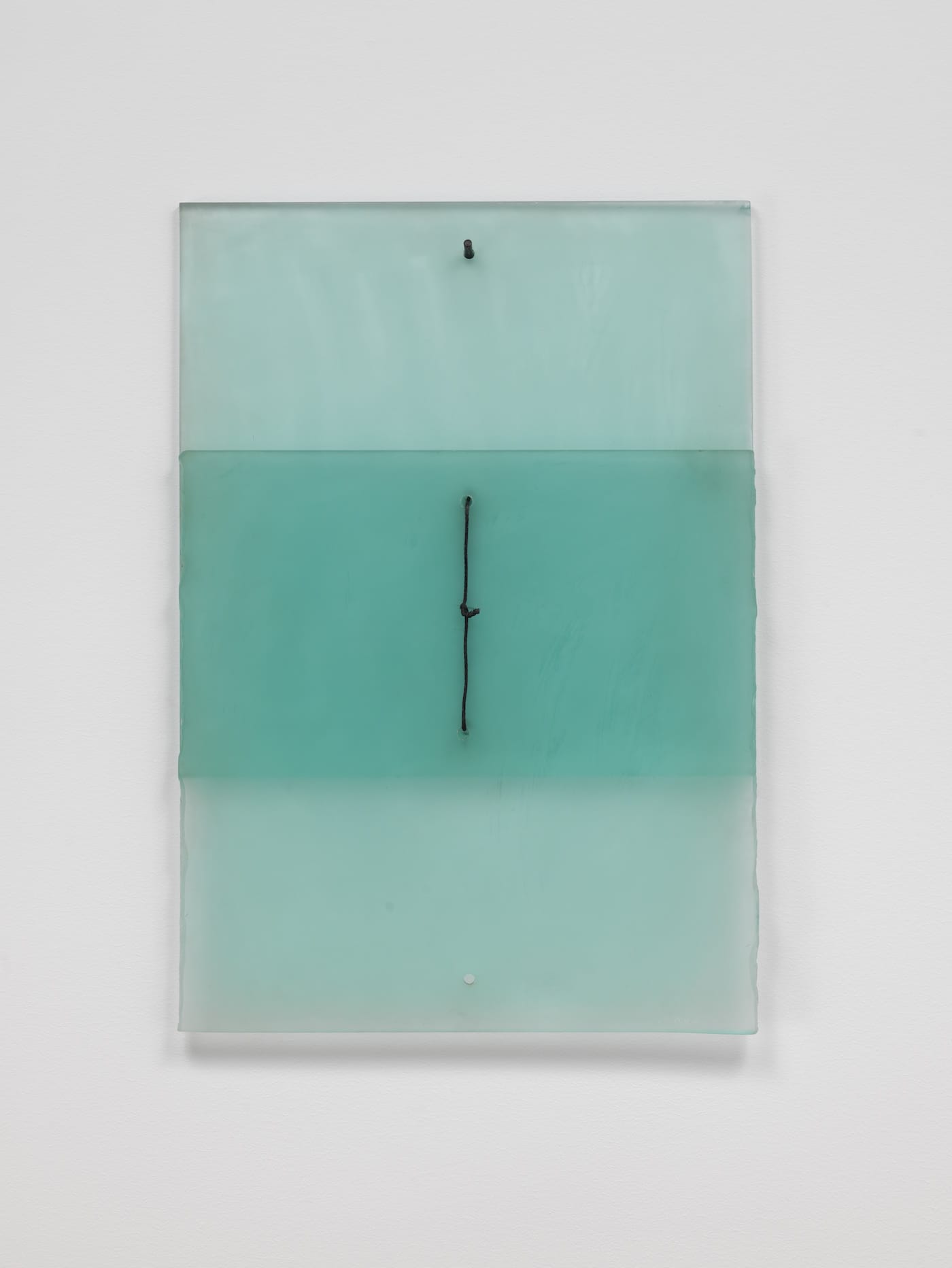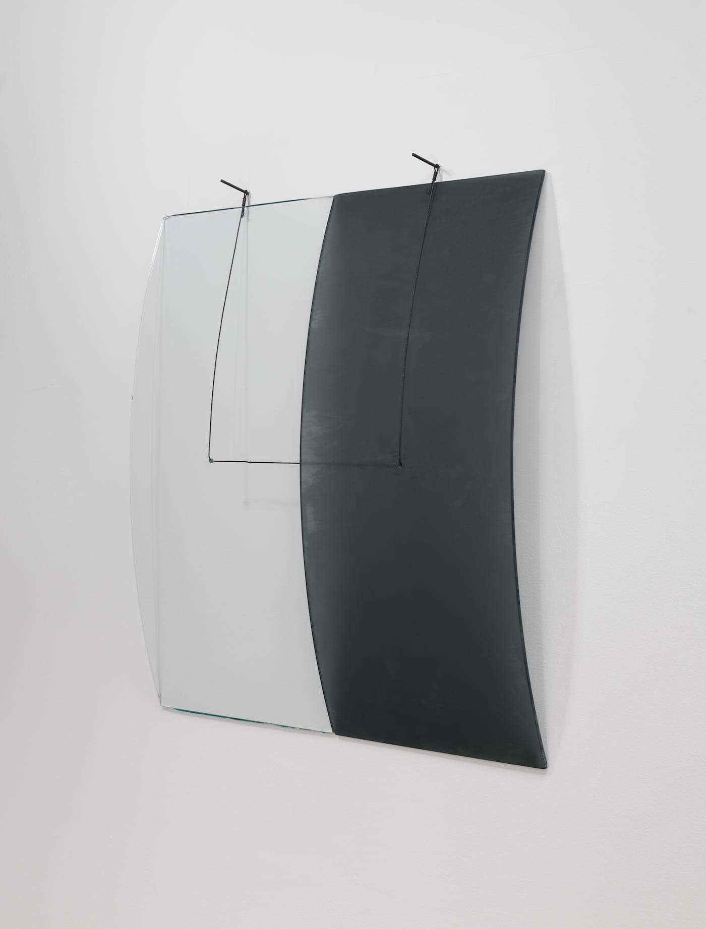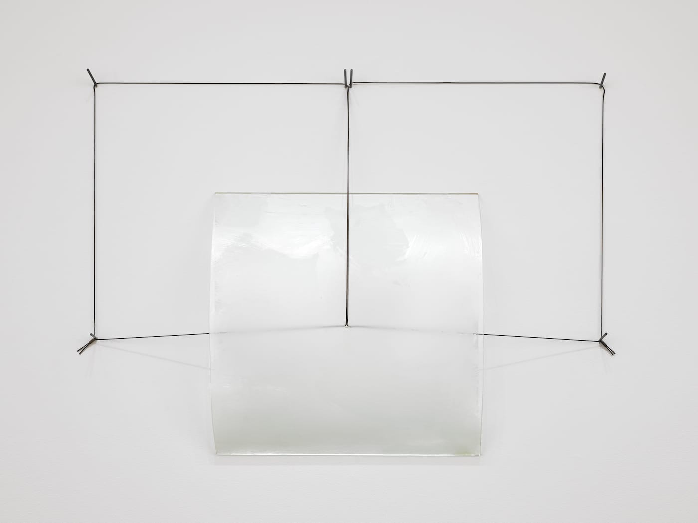“Half Open Drawing” (1971) mounts on the wall a piece of etched glass, relatively transparent at the top and bottom, more translucent at the center, on a steel cable. “Untitled” (ca. 1974), which suspends a sheet of transparent glass on the left side, with a heavily etched glass on the right, in front of a rectangle cable, is hung from two wall pins.