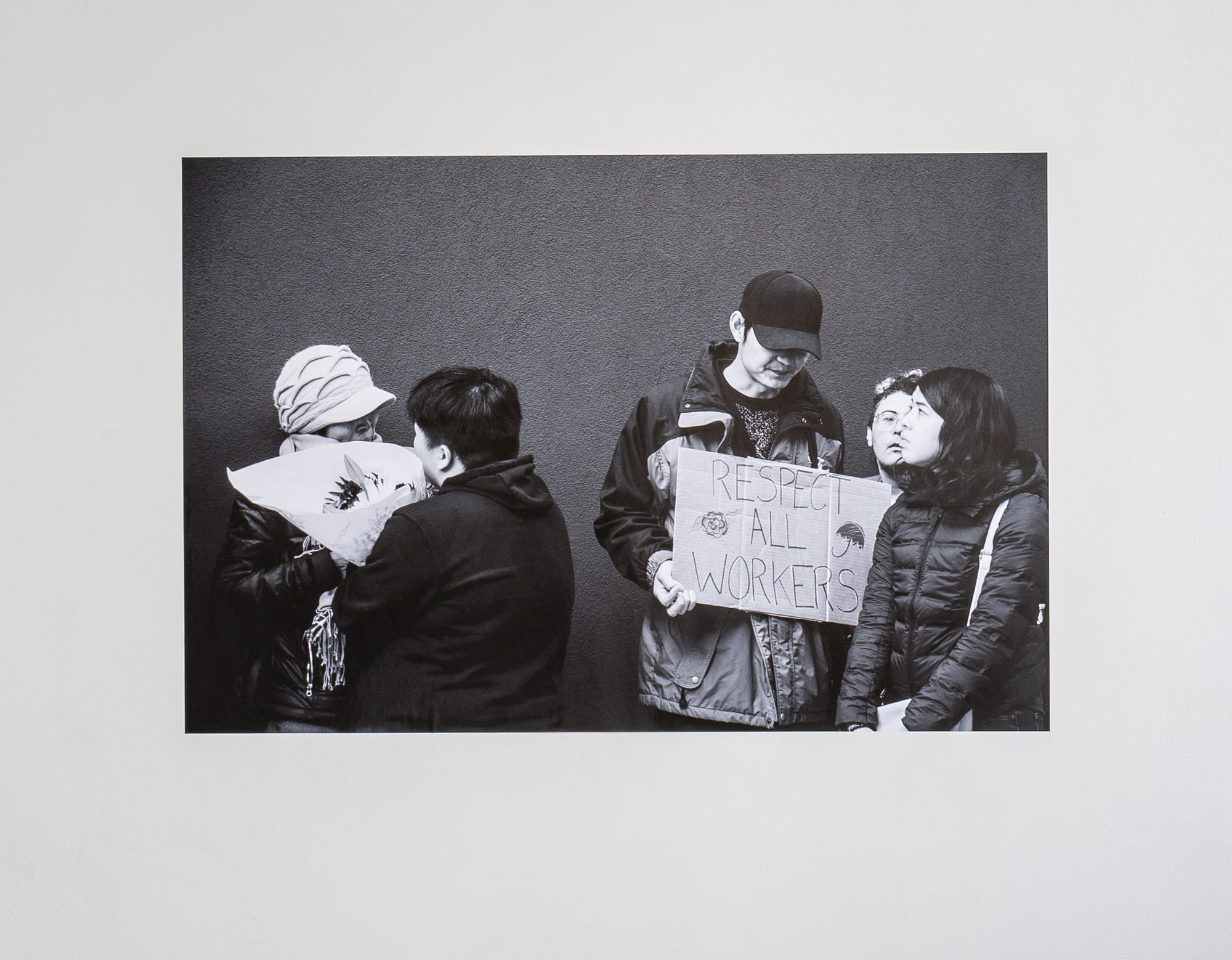 The photograph and video artworks by Sihan Cui consider Chinese immigrant stories local to New York. “After 365 Days 1” (2019) shows the family of Yang Song, a Chinese sex worker who died following a 2019 police raid of a massage parlor in Flushing, New York, protesting the police narrative. The video recounts recent Chinese immigrants’ stories of harrowing isolation and grueling labor conditions, supplemented by a reprint of activist photojournalist Corky Lee’s documentation of a 1975 Chinatown protest.